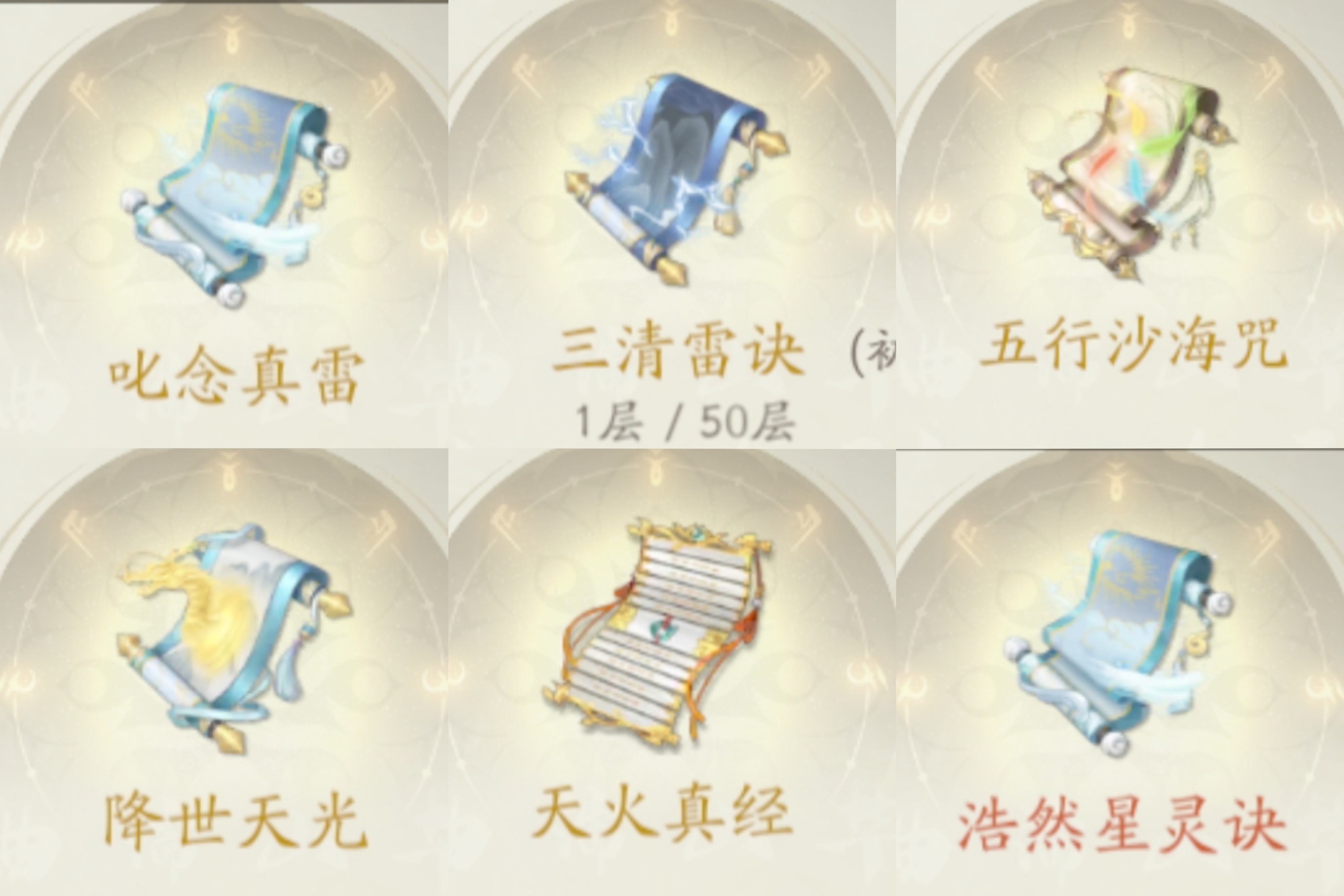 ①叱念真雷+②三清雷决+③五行沙海咒+④降世天光+⑤天火真经+⑥浩然星灵决