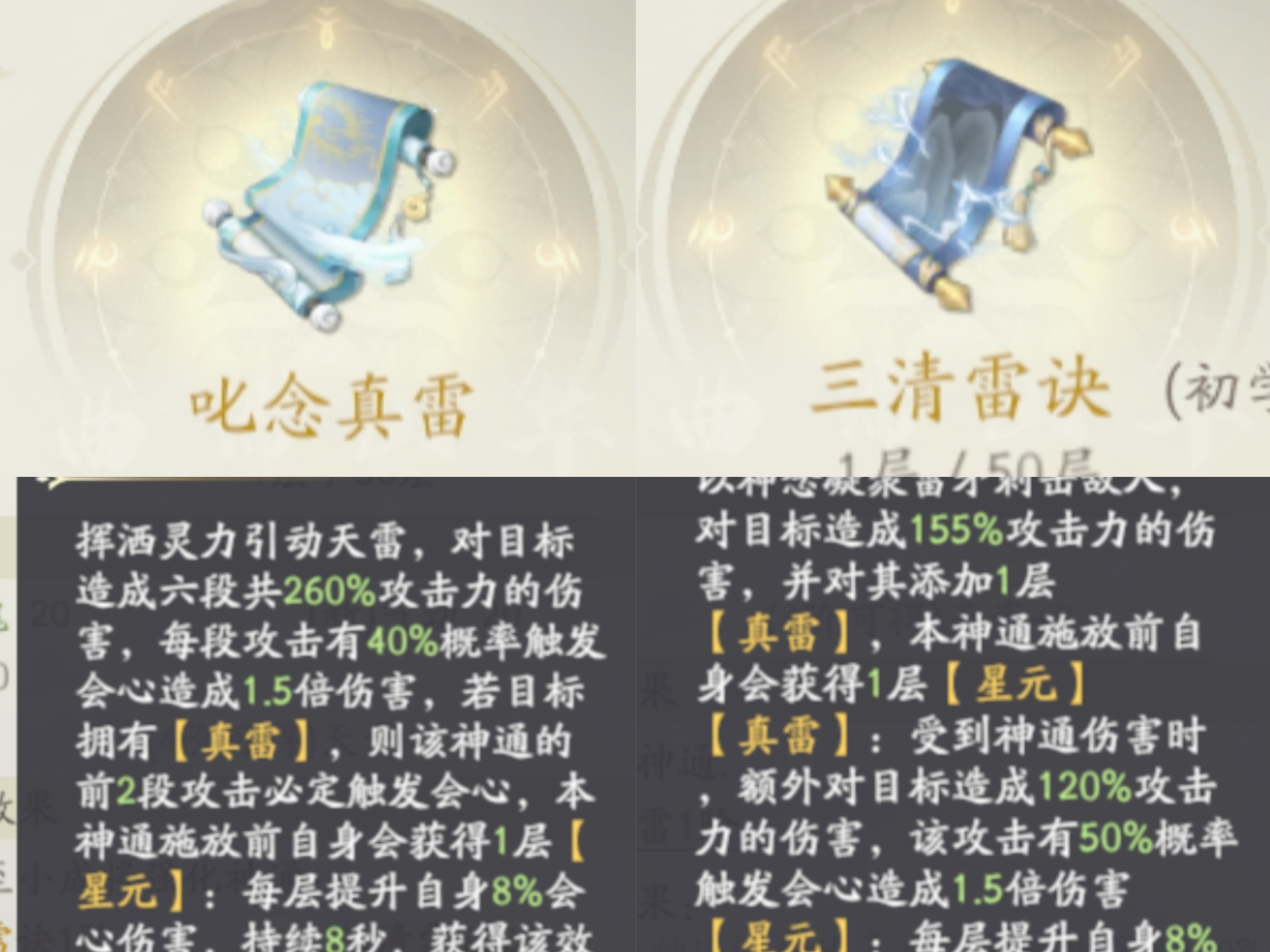 第一个就是吃念真雷和三清雷决为一个组合技,缺一不可,真雷一定要放在雷决前面,才可以打出雷决的百分百的暴击效果。