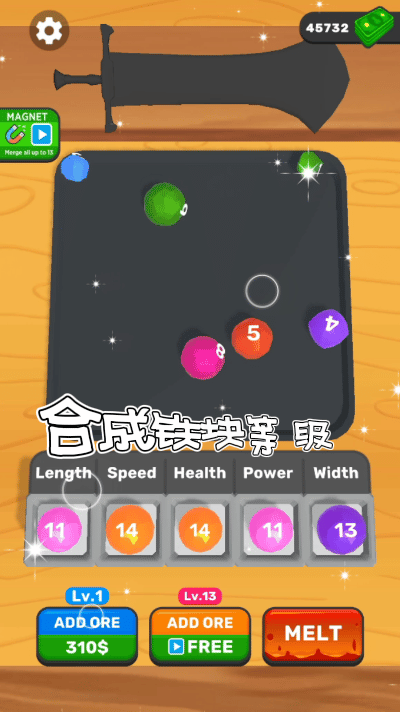 📝游戏内提供了充足的资源💰,我们可以不受任何限制的制造出各种等级的铁块,将合成的铁块放入五个空位中👀,通过合成高等级的铁块制造不同样式的宝剑。