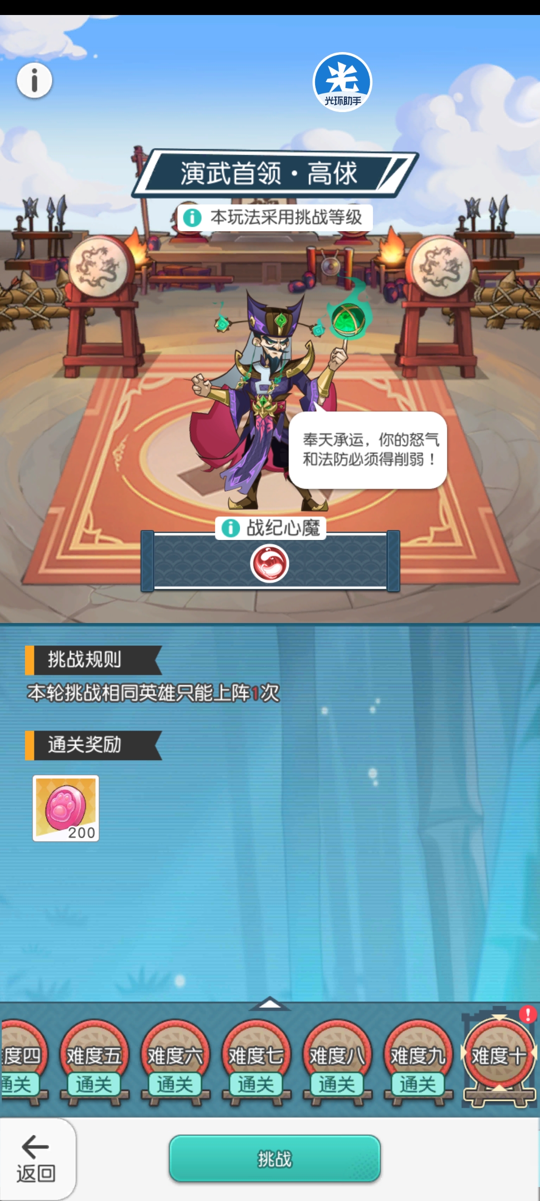 3.敌方英雄(神话童贯、神话朱武、神话高俅)VS我方英雄(精英+郝思文、传说+扈三娘、神话燕青)站位:郝思文1号位、扈三娘2号位、燕青5号位(正常输出即可)该阵容应对关卡难度:★☆,一次性过关几率:99%。