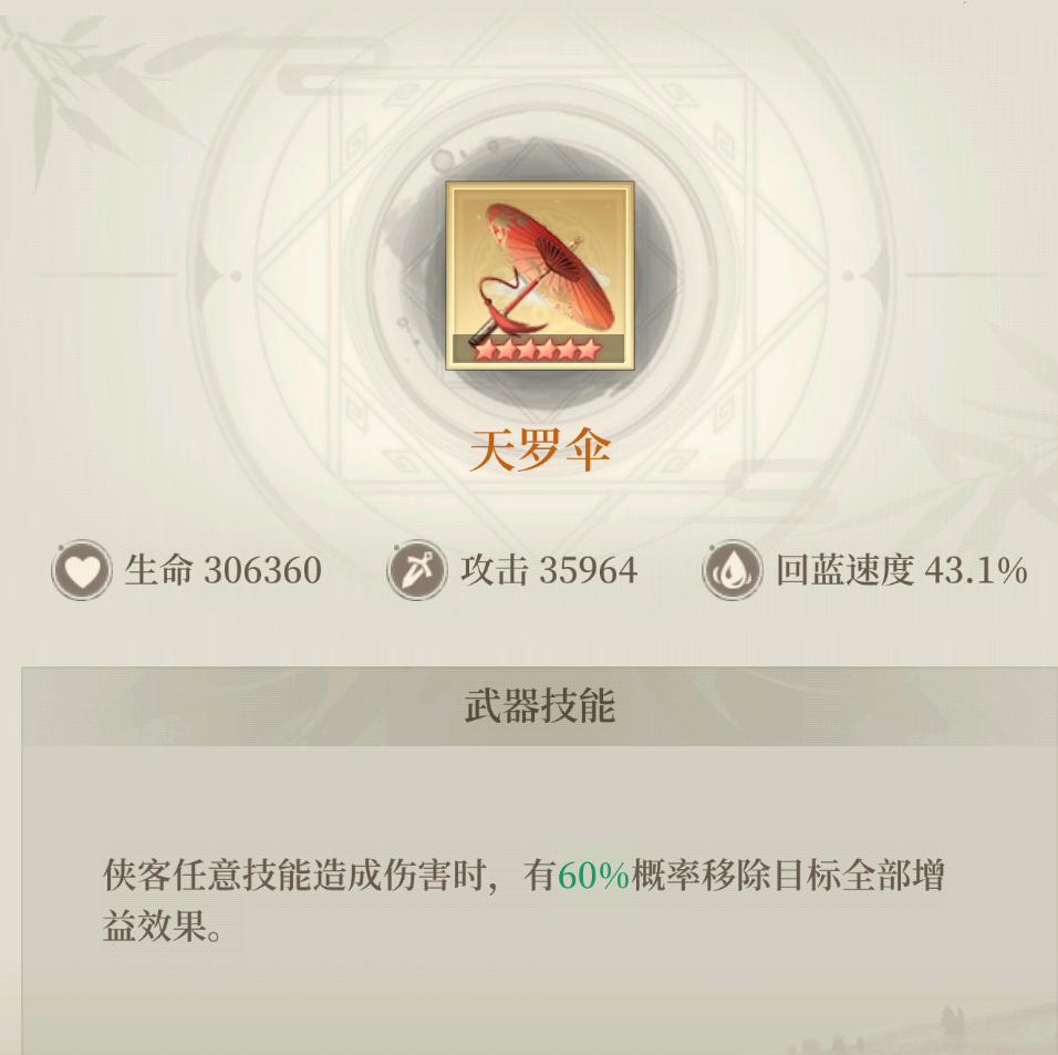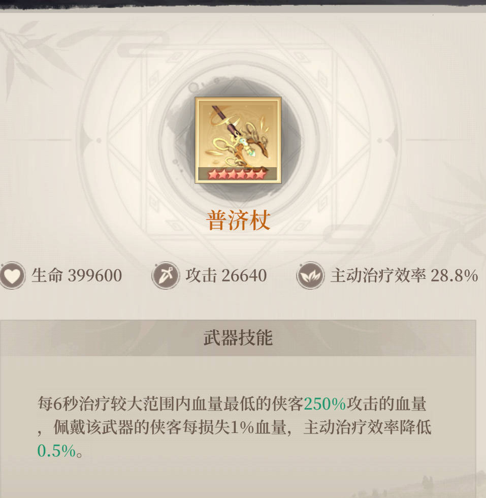 流云扇平替版,适合没有主动治疗技能的辅助侠客,该武器对侠客自身生存有一定要求,否则治疗效果不算太佳,推荐辅助侠客如尸祖阵容降臣、漠北阵容述里朵等佩戴,可以保证己方血量