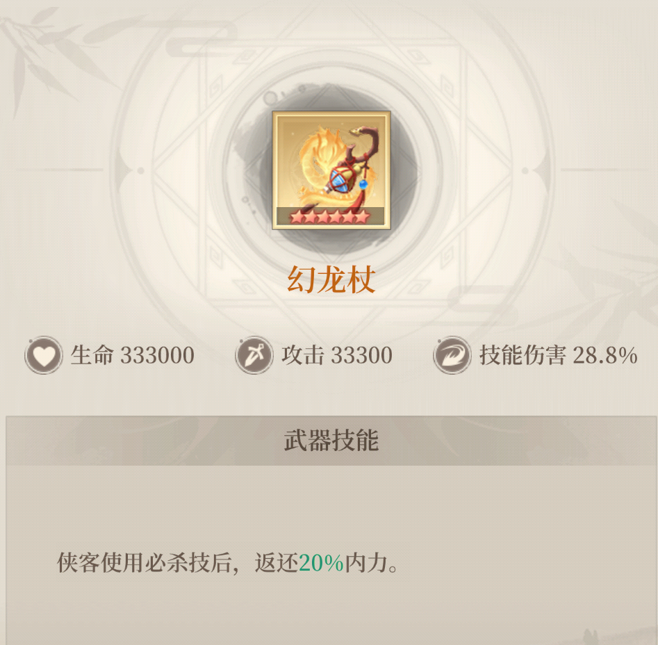 幻龙杖内力返还相当于降低必杀释放门槛,适合必杀强势的侠客,利用高频必杀释放拉开双方优势;大部分侠客均可考虑佩戴,目前主流阵容推荐尸祖阵容侯卿、气宗阵容女帝&袁天罡