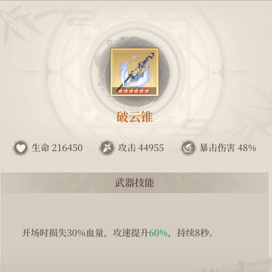 破云锥开局大幅攻速提升,适合快速启动抢占先手的侠客,如辅助蚩梦、射手巴也等;损失血量对于万毒阵容尤川快速召唤兵神也有一定帮助,但容错率相对较低