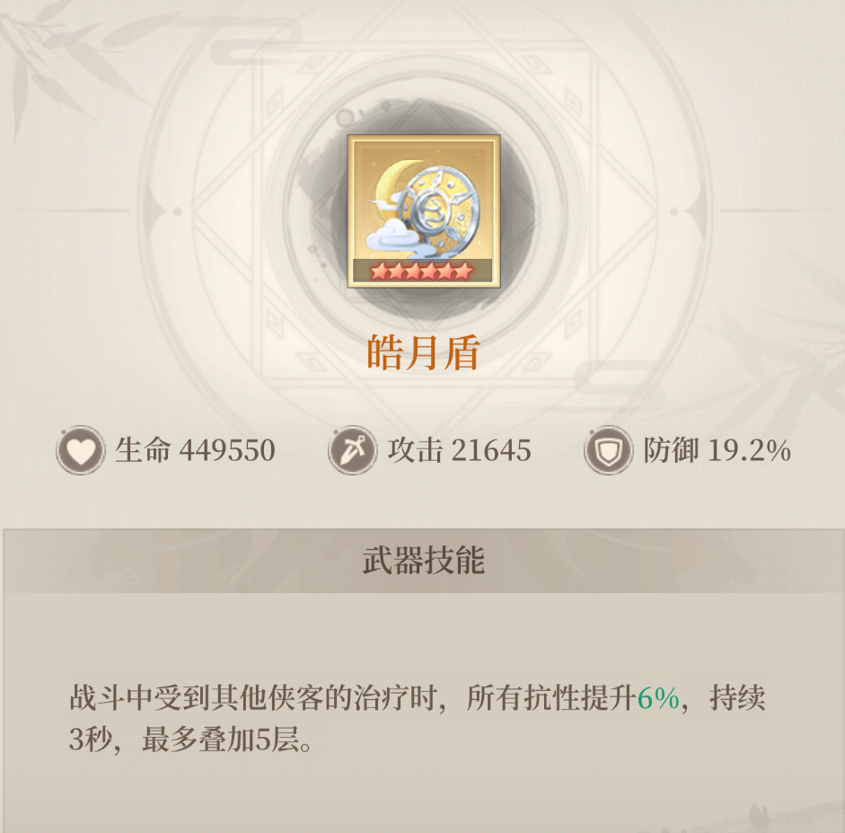 肉盾侠客专属护盾,皓月盾和飞鱼盾选择一个即可;皓月盾以自身生存为主,飞鱼盾以减益为主,推荐惠明、倾国、旱魃等金刚侠客佩戴