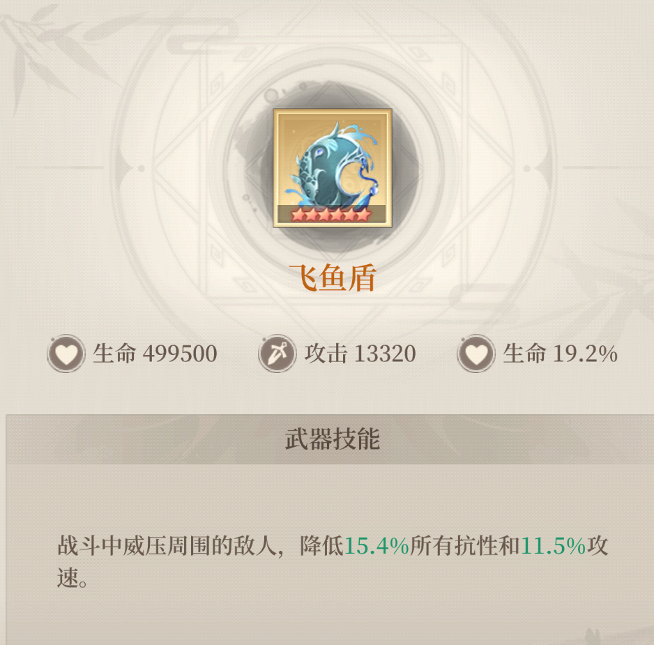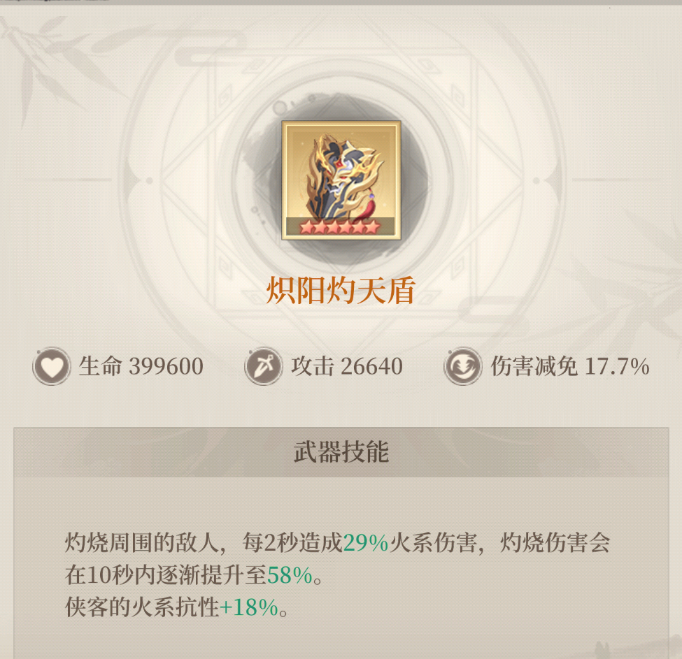 旱魃专属武器,旱魃佩戴炽阳盾可以保证自身生存和火系持续消耗能力,其他侠客并不适配
