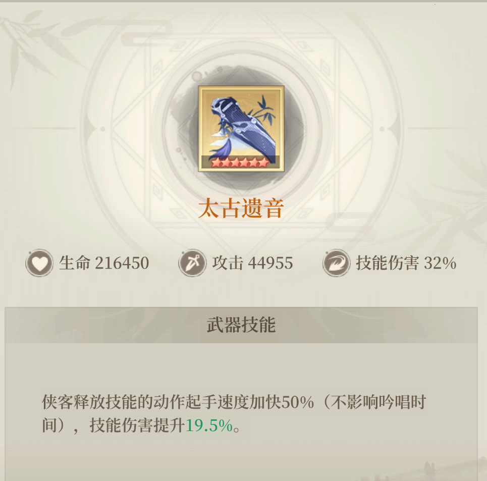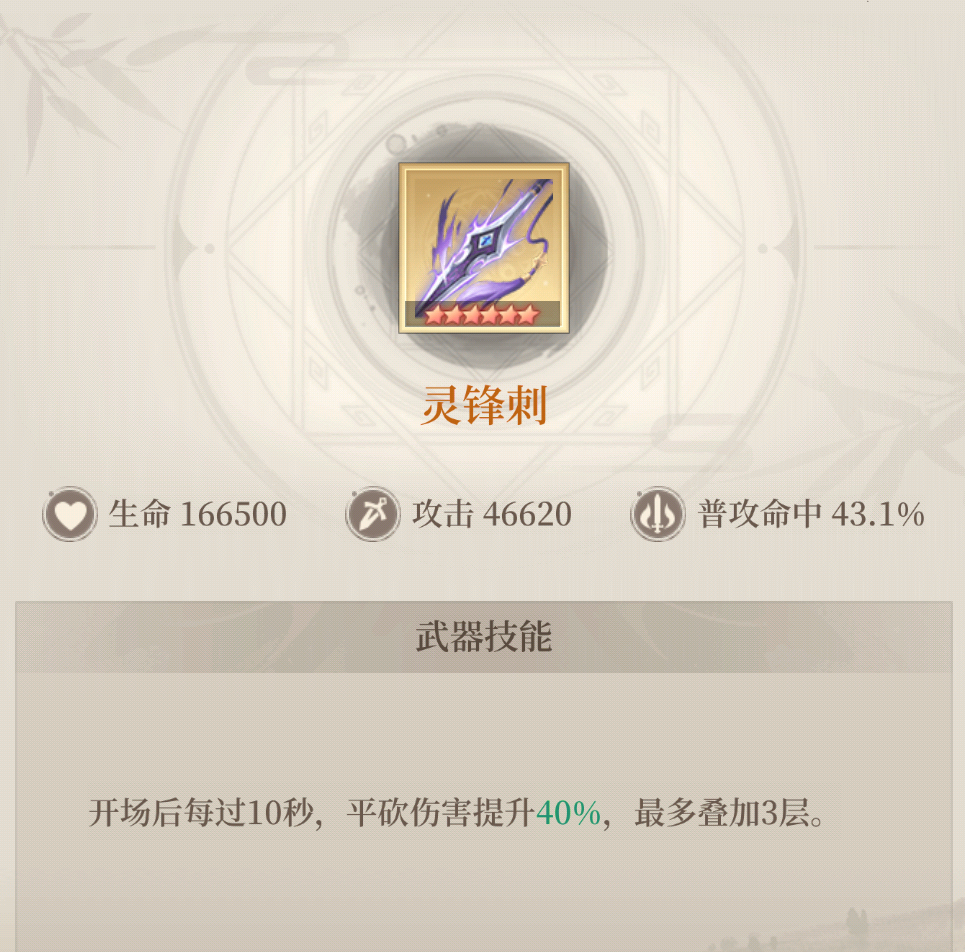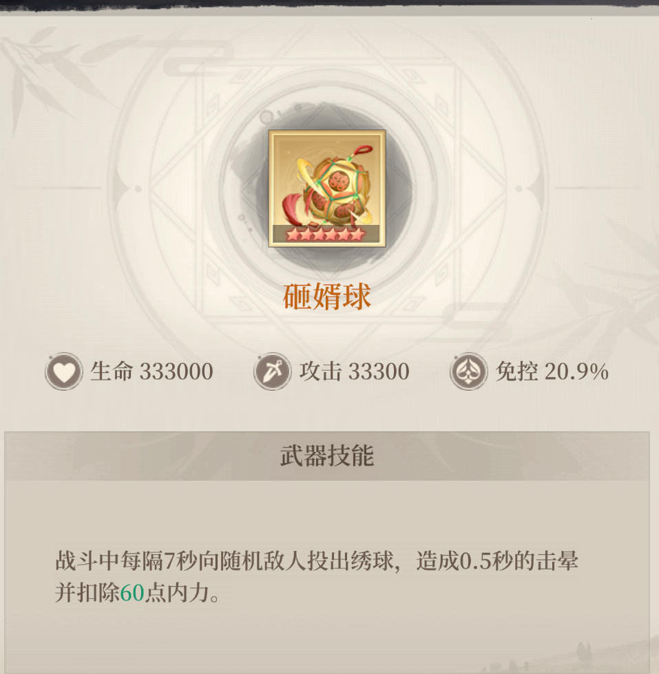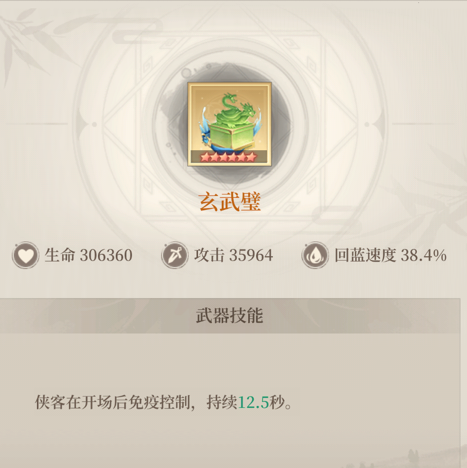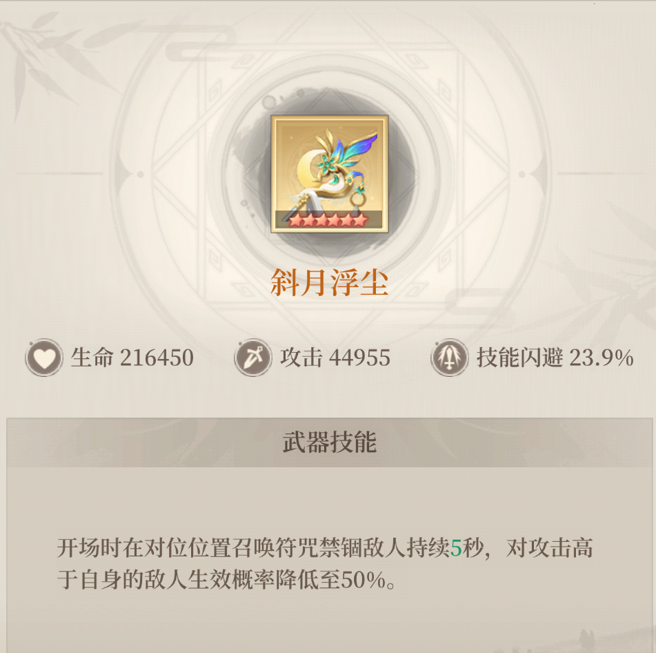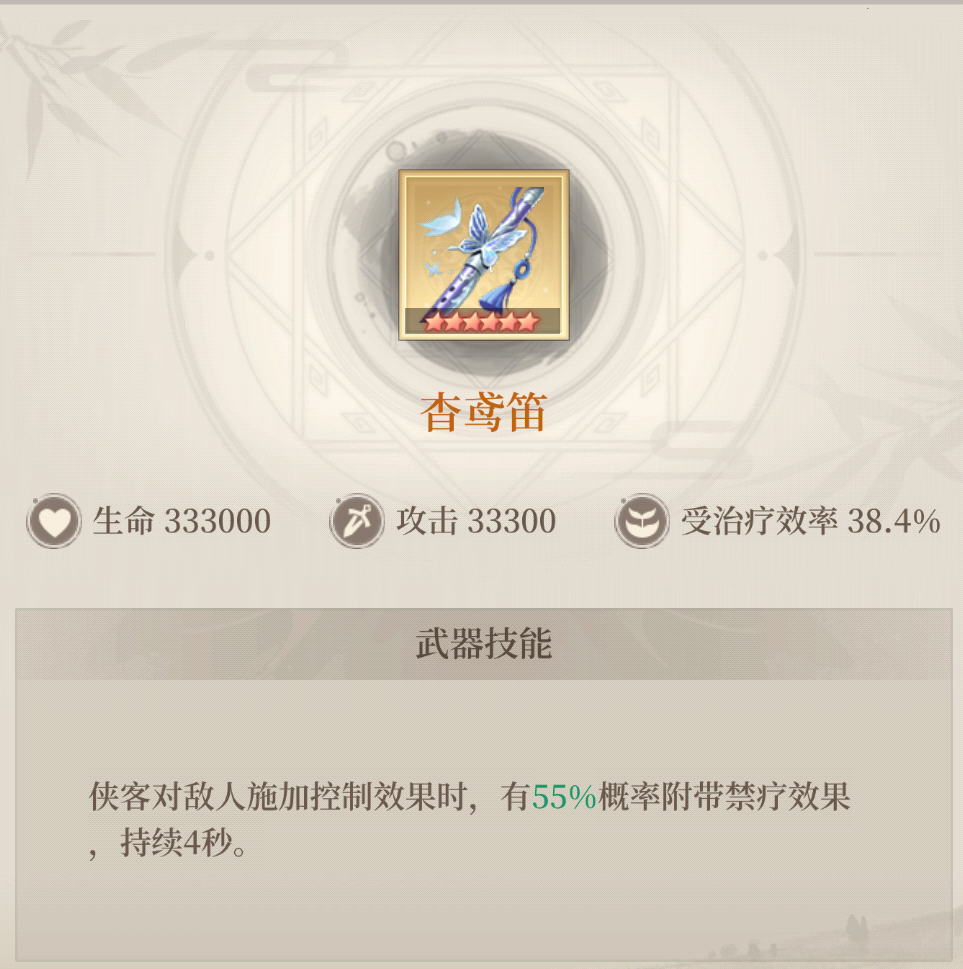 姬如雪专属武器,可以备选培养;控制概率施加禁疗效果,对于侠客控制能力有一定要求,目前侠客中仅姬如雪控制概率较高,可以限制敌方恢复