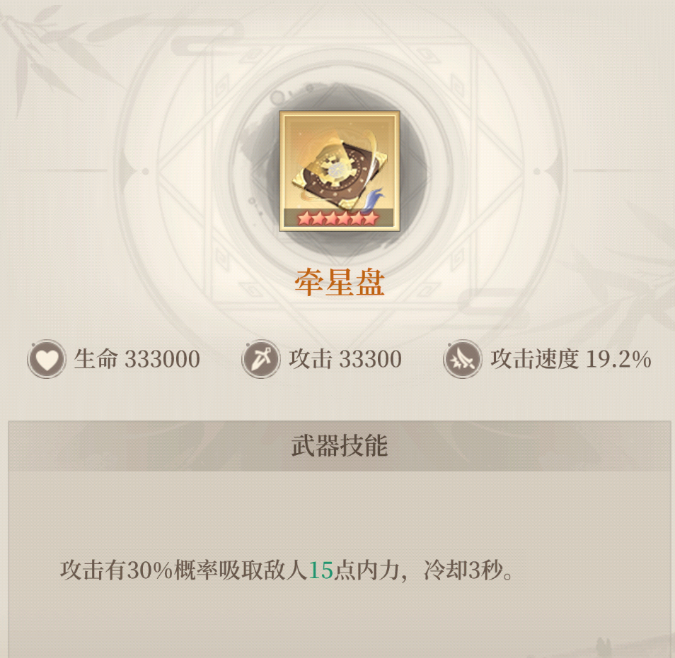 被削弱前很好用,主将使用攻速提升+吸取内力可以很快拉开双方差距,保证己方启动速度,被削弱后效果不如之前,目前比不过其他输出武器,可以暂时放弃
