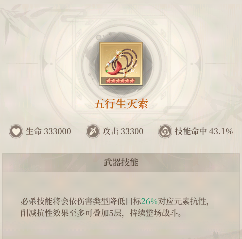 专克金刚肉盾武器,有能力玩家可以培养,平时给副将或者三核,越战可以考虑给主将,对于强势肉盾无法破防可以考虑主将佩戴五行生灭索或者上阵降臣破防;推荐气宗阵容李存礼&张玄陵、巫师阵容蚩离