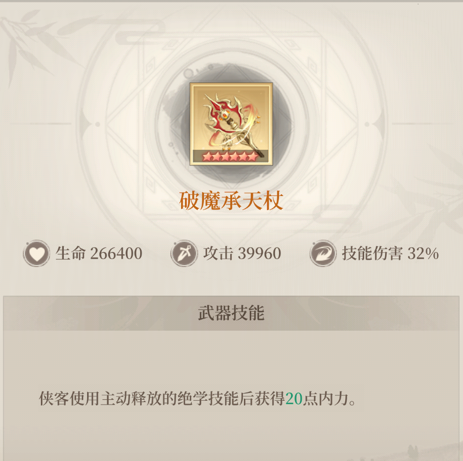 破魔杖必杀绝学联动回气,适合必杀绝学均强势且绝学冷却时间较短的侠客,如果仅依赖必杀更推荐幻龙杖;佩戴方面推荐气宗袁天罡(可以保证自身技能高频释放,保证自身坦度)
