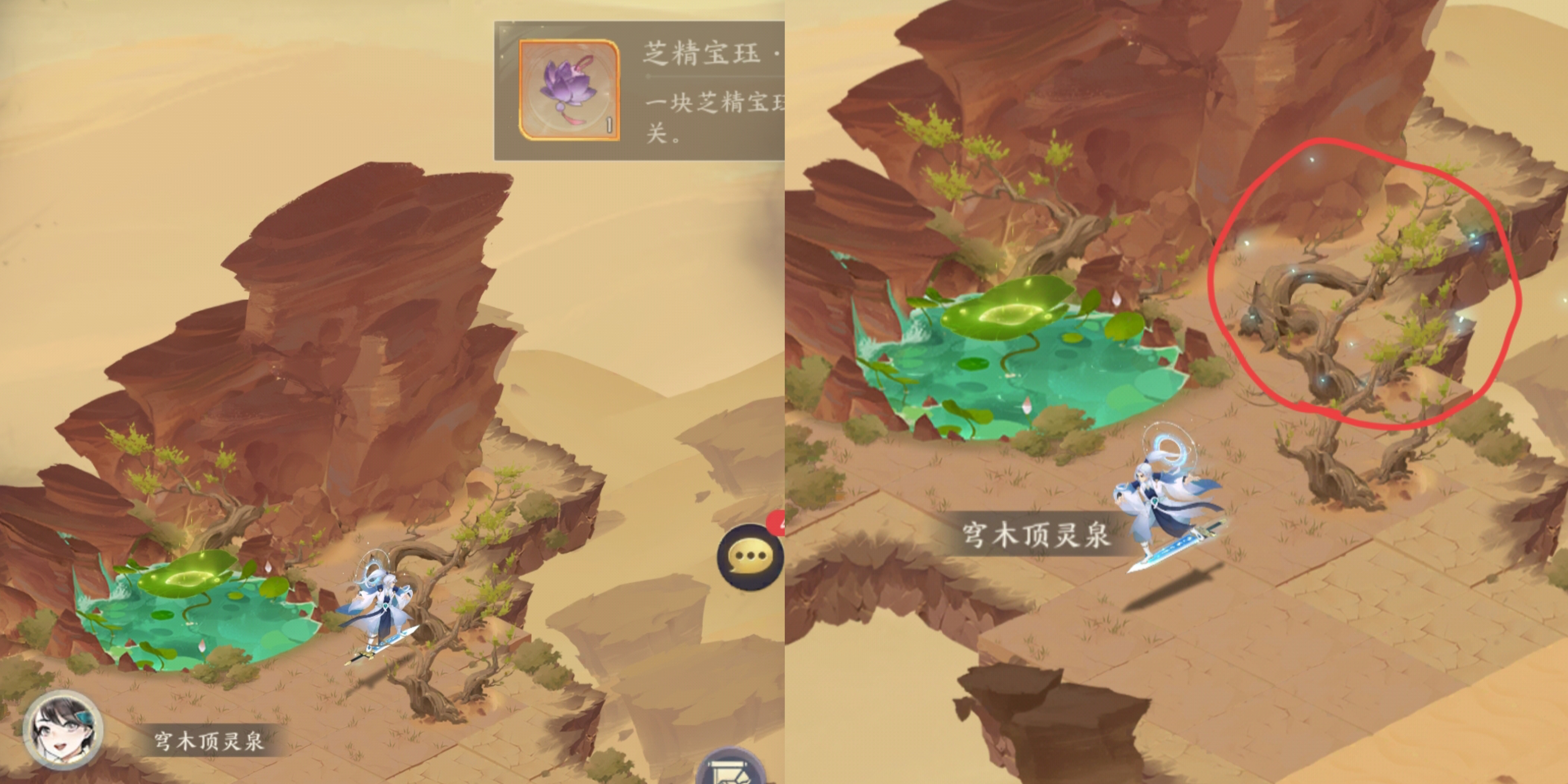 ③完成就第二条线索和第三线索以后,回到第一章【穹木顶】,在穹木顶的灵泉处的旁边的一个树木,可以获得芝精玉林的第一条线索的关键道具(芝精宝钰)。这里要注意灵泉旁边的树林要走到树林边上,然后多点几下,方可获得第一个关键道具芝精宝物。