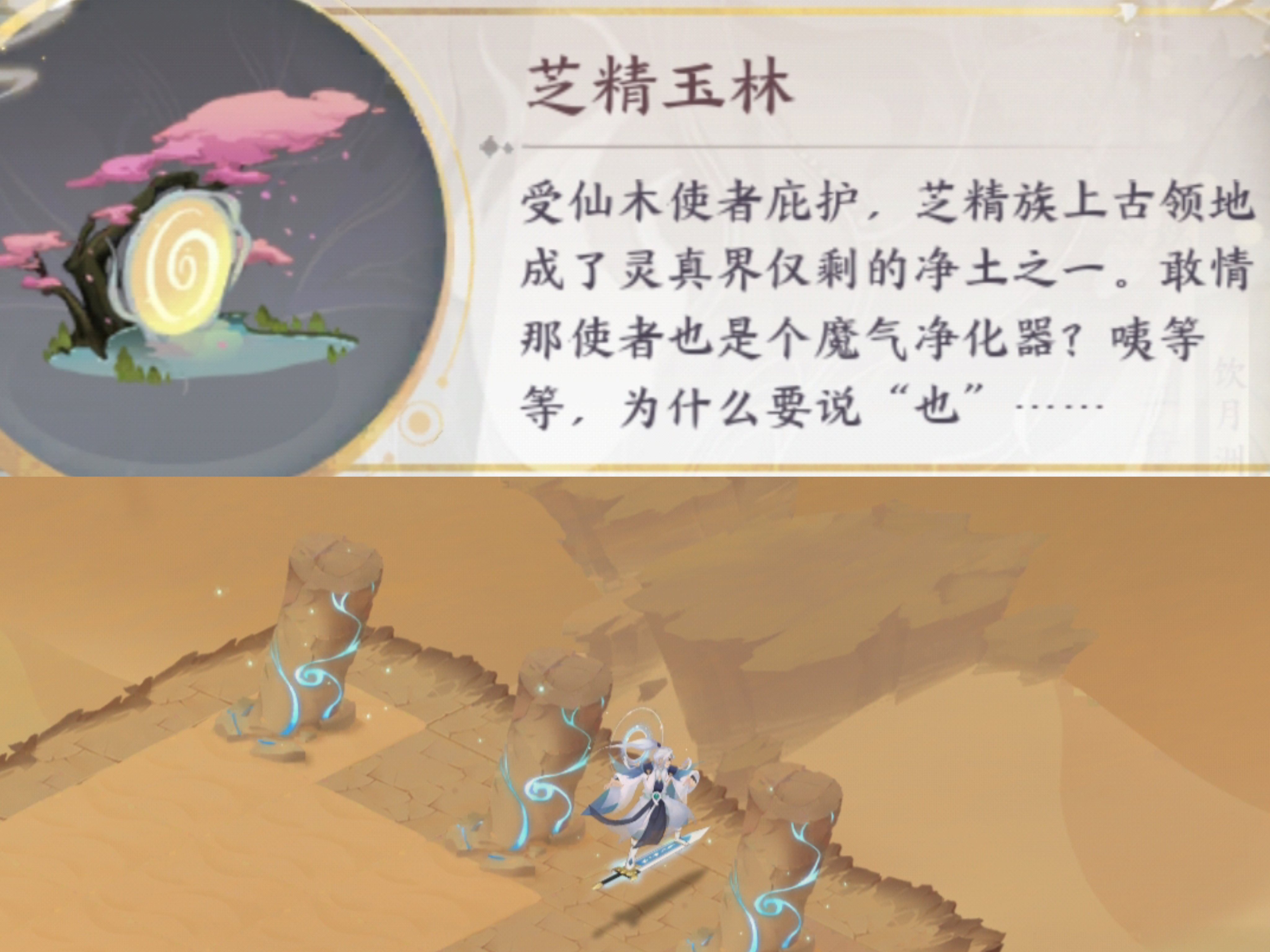 2:芝精玉林第三条线索–【饮月州】②接取任务,需要帮助因为迁徙而走散的小芝精找回部落,第三条线索也在饮月州,跟着任务走就行,地图慢慢探索,在图下方的位置,会有三个封印柱子,柱子前面会有一群芝精的种族(ps:因为我完成了任务,所以芝精部落的人不显示),把小芝精带回到芝精部落就可以了。然后会给你芝精会感谢你,并且给你第三条线索的关键道具。