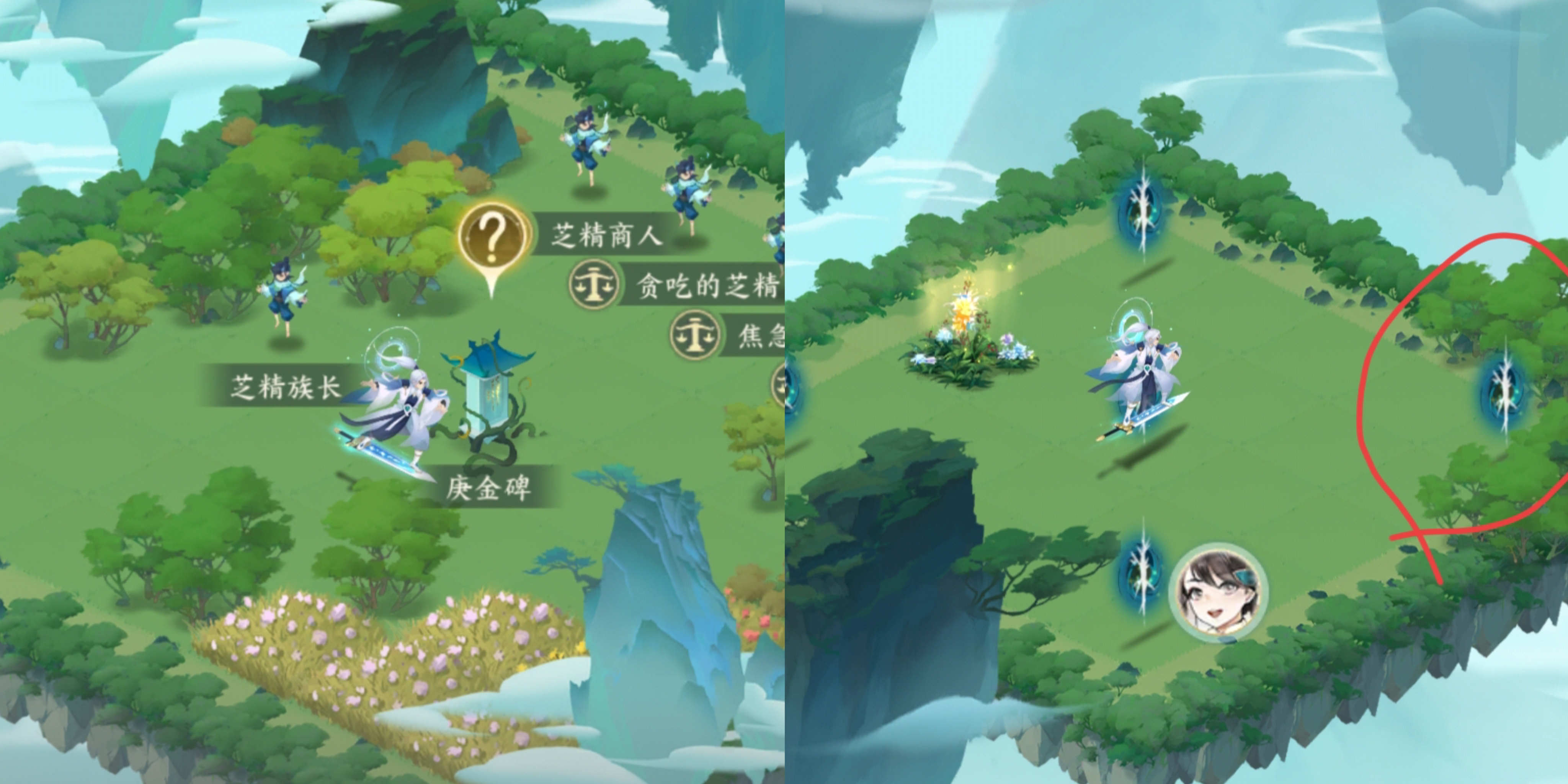 ⑤芝精玉林仙气缠绕,树林繁盛,和迷宫差不多,那么芝精玉林里该如何走呢?这里教大家一个方法,每次通往传送阵的时候往四个角落最茂密的树林方向走。