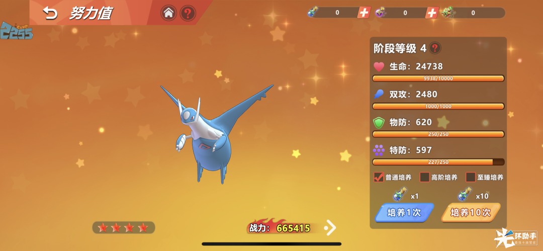 努力值可以提升宝可梦的生命、双攻、物防、特防属性,3种培养方式对应3种道具,其中普通培养可能减少属性,高阶和至尊培养都是只增加属性。