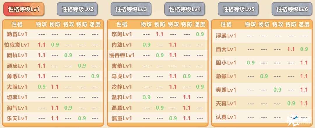 不同的性格会对宝可梦带来不同的属性系数影响,如下图: