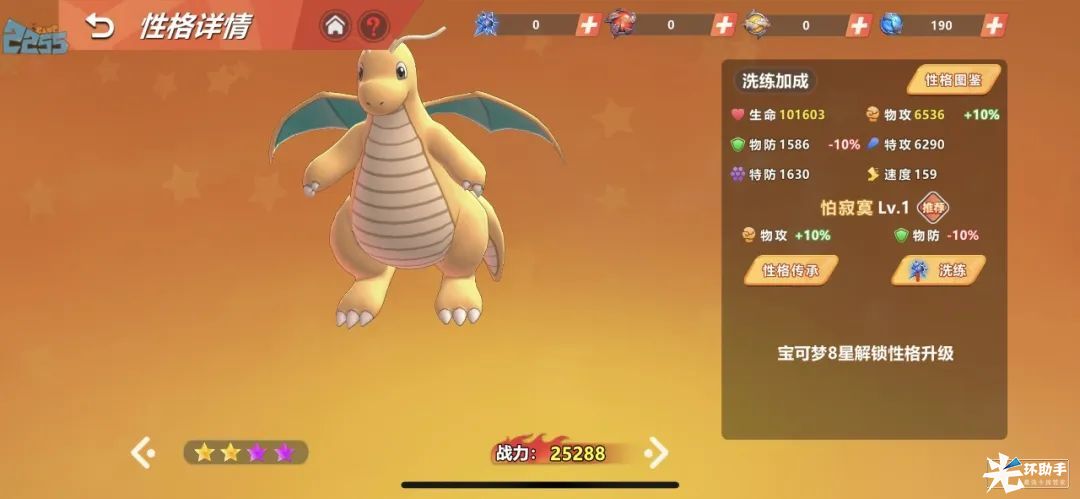 点开性格旁边的问号可以看到当前宝可梦的性格信息,方框中的代表系统推荐的性格,星星标记的代表当前宝可梦的性格。