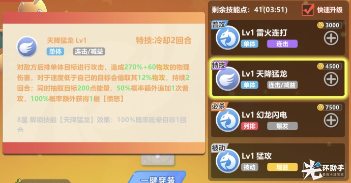 以快龙的特技“天降猛龙”为例,技能效果为“对于速度低于自己的目标会偷取其物攻”。