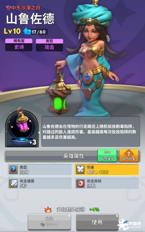 技能效果:山鲁佐德会在怪物的行走路径上随机投放剧毒陷阱,对路过的敌人造成伤害。星级越高每次投放陷阱的数量越多且伤害越高。
