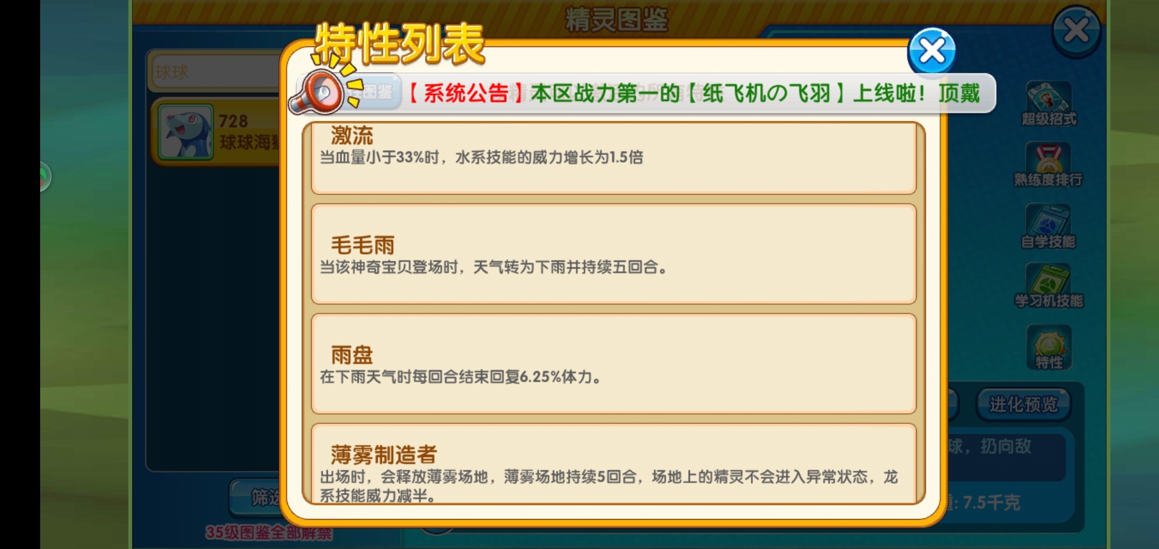 个人只推荐薄雾制造者,这个可以适当5回合薄雾场地,目前这个只有白龙、琪琪有这个特性,而这个特性的强大之处,那就是让队友不怕异常状态,猛毒、电磁波、鬼火、催眠随便吃,反正在场地下不会受到影响,对饱受状态队欺负的玩家来说是个非常好的福音。
