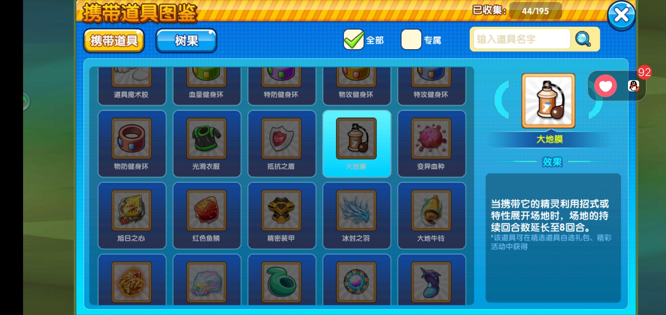 它的携带物很多,剩饭、凹凸头盔、附着针、道具魔术胶、狗粮、大地膜、光之黏土都可以选择,我推荐有条件的玩家以后带个狗粮或者大地膜,前者可以帮它弥补血量弱点,后者可以让场地保持更长,如果没条件的就带个剩饭凑合,也是非常好用。树果建议携带捕虫网。
