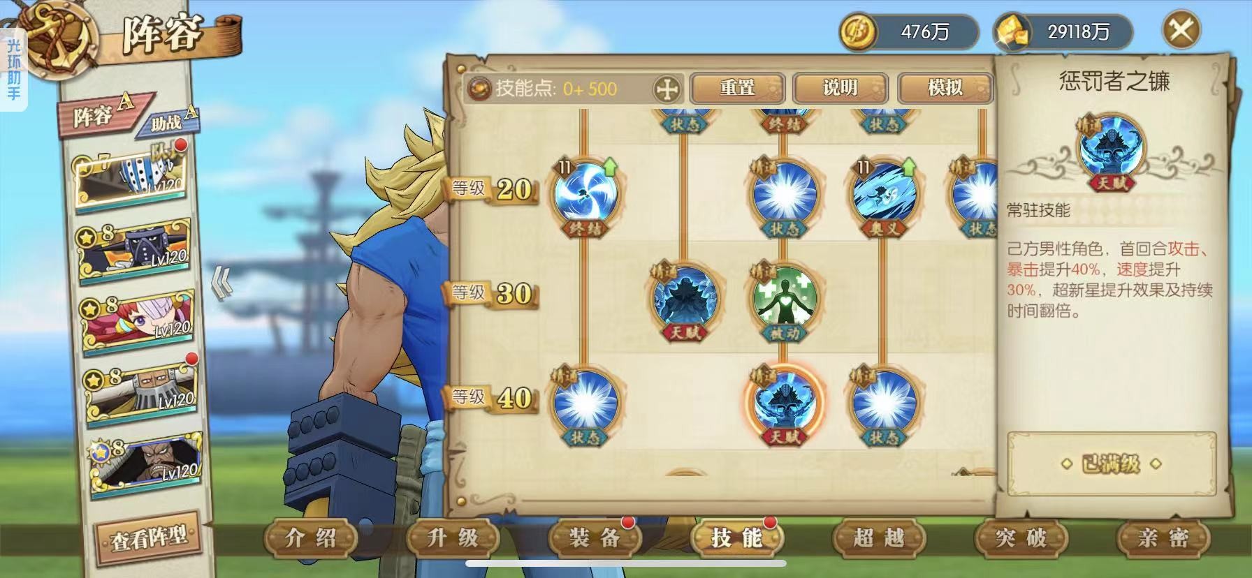 天赋说明:己方男性角色,首回合攻击暴击提升40%,速度提升30%,超新星提升效果及持续时间翻倍。