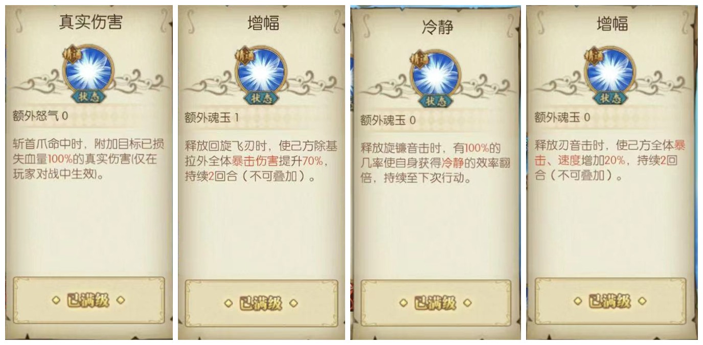 天赋说明:回合开始时,获得1层持续1回合的镰之印,镰之印会抵挡一次致命伤害,抵挡致命伤害时会为基拉回复30%的生命值,回合开始时,如果没有镰之盾,则获得自身最大血量100%的镰之盾,护盾存在期间,自身最终伤害减免提升50%,护盾破碎时,对敌方全体造成震慑,该效果会使魂玉小于一定点数的目标眩晕,使正在行动的目标攻击降为1,持续1回合。