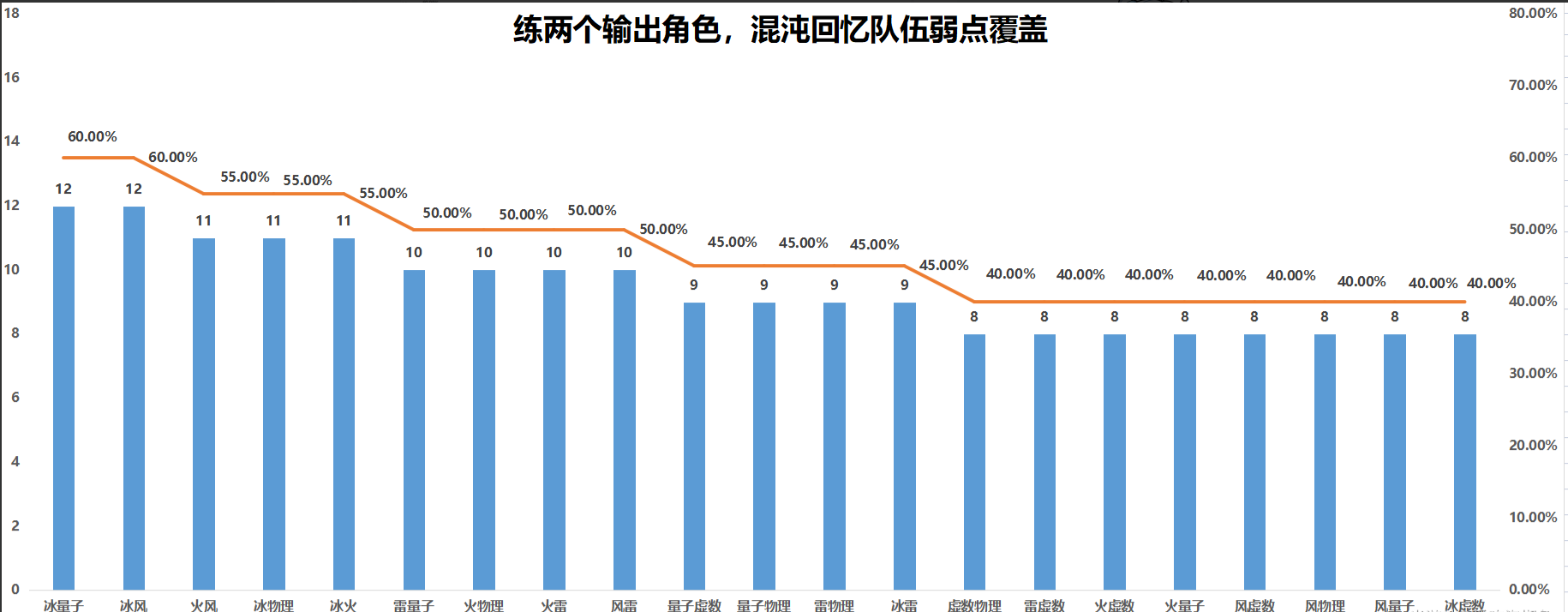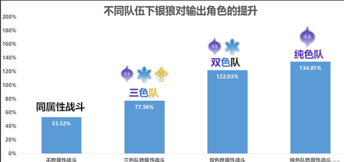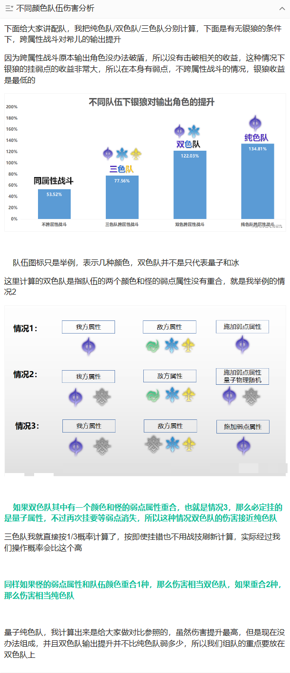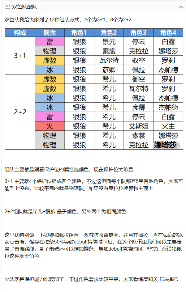 因为目前玩家高练度输出角色,多数为两个属性,我把对应2个属性可以完全覆盖的队伍数量给大家统计出来,队伍分析我会把银狼自身分析完再讲,包括银狼可以组的12个双色队伍