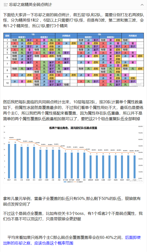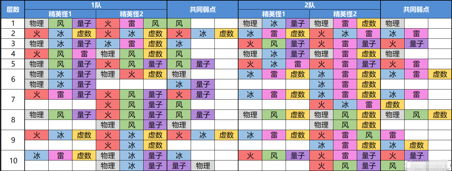 为了更直观的看出银狼对我们现有配队帮助多大,我把忘却之庭混沌回忆,精英以上敌人弱点全部统计后,然后把每队的共同弱点属性汇总