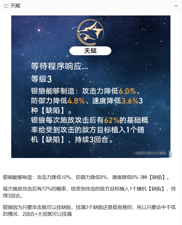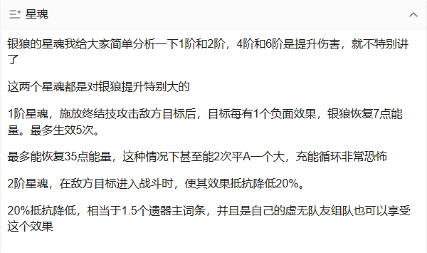 本篇攻略主要为面向平民玩家,走辅助流路线的0阶星魂银狼,如果对6阶星魂输出流银狼有需求,我可以给再出一期,下面讲的技能都是10级倍率