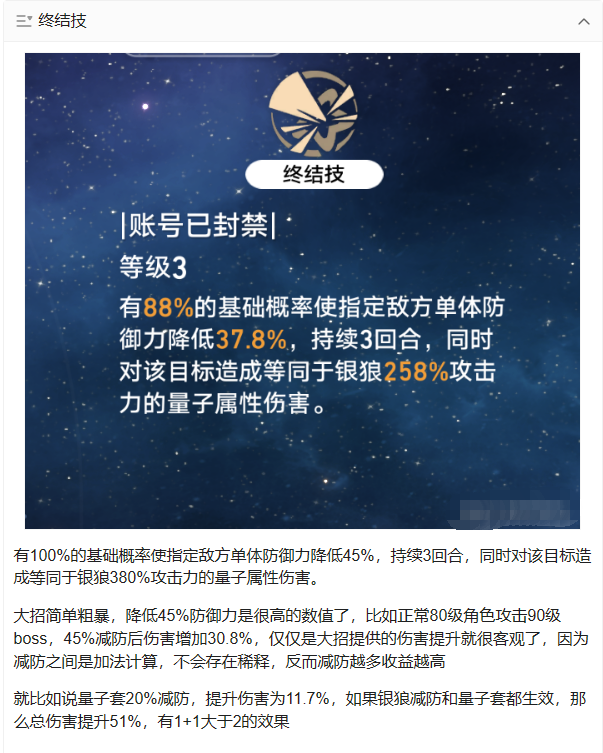 银狼提供的伤害为,被动加缺陷8%减防,大招减防45%,战技减抗性10%,行迹效果目标在3个弱点以上增加3%减抗