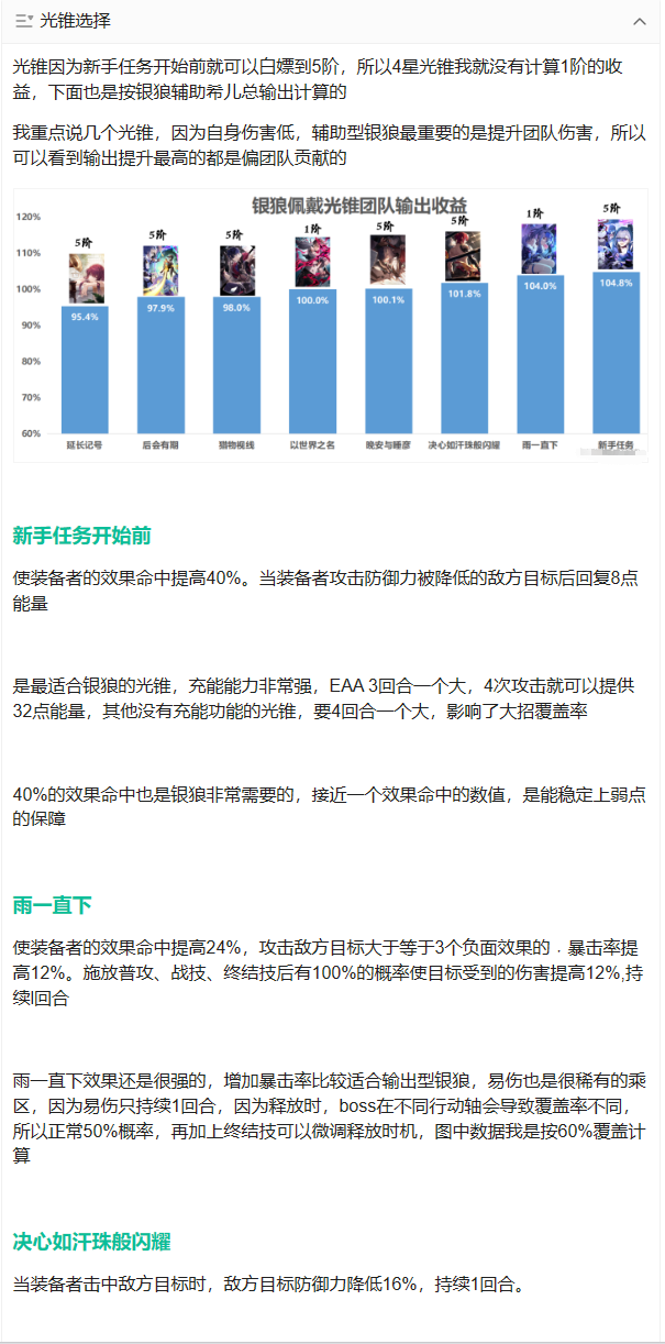 作者:爱吃泡椒兔,这期银狼攻略我不仅把银狼的遗器和光锥对收益计算出来,也把银狼在不同颜色数量的队伍伤害给大家列出来