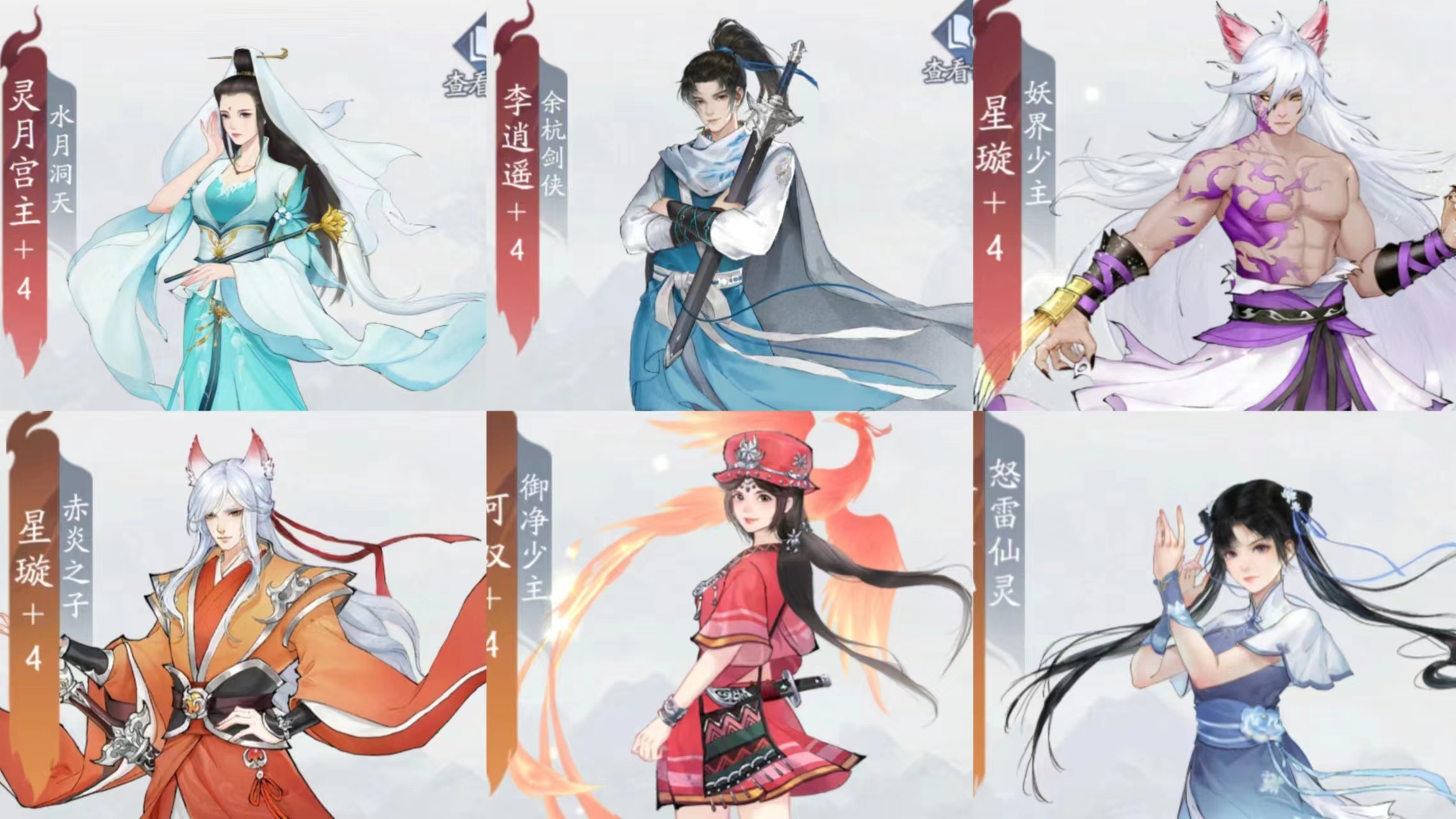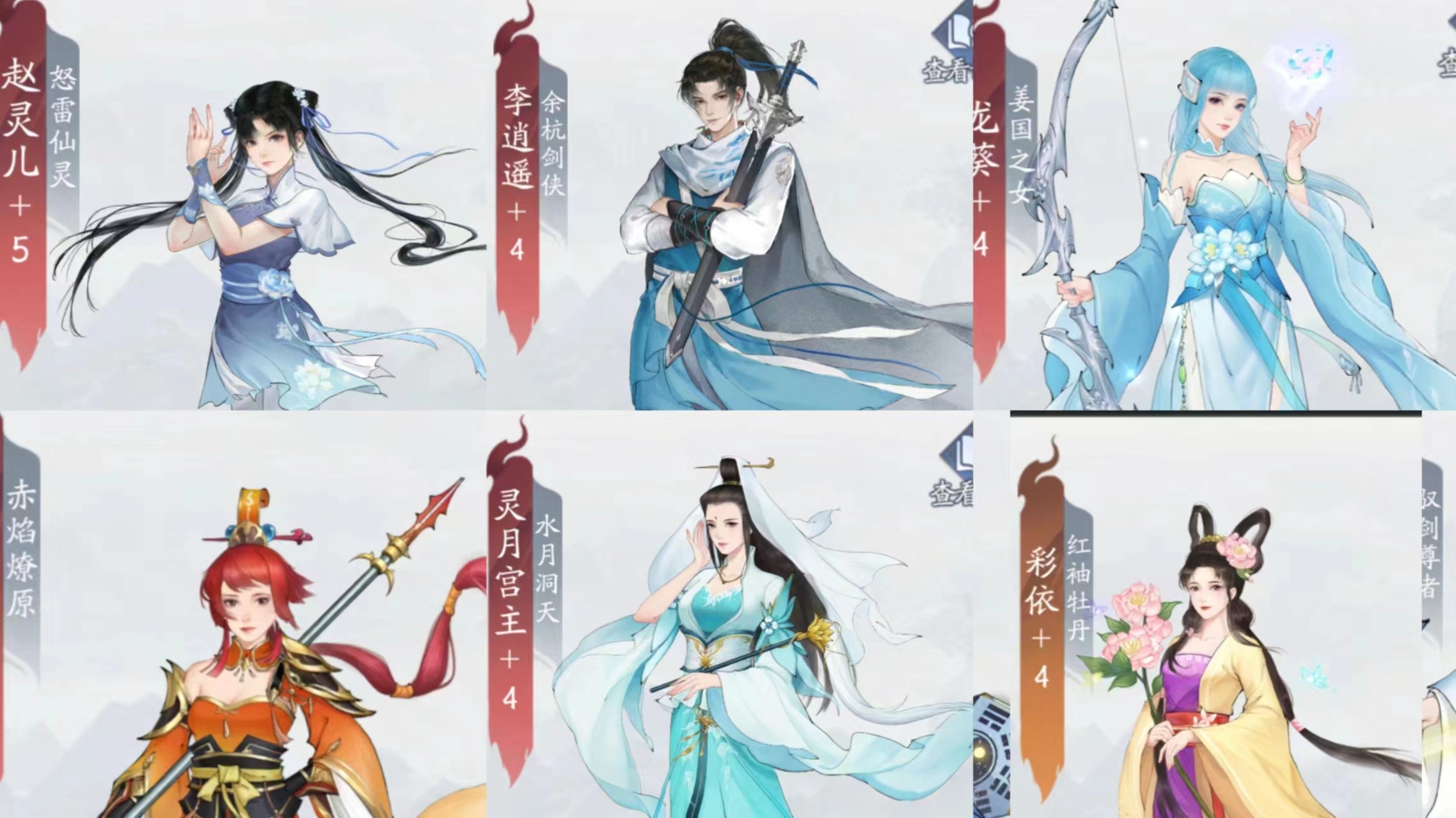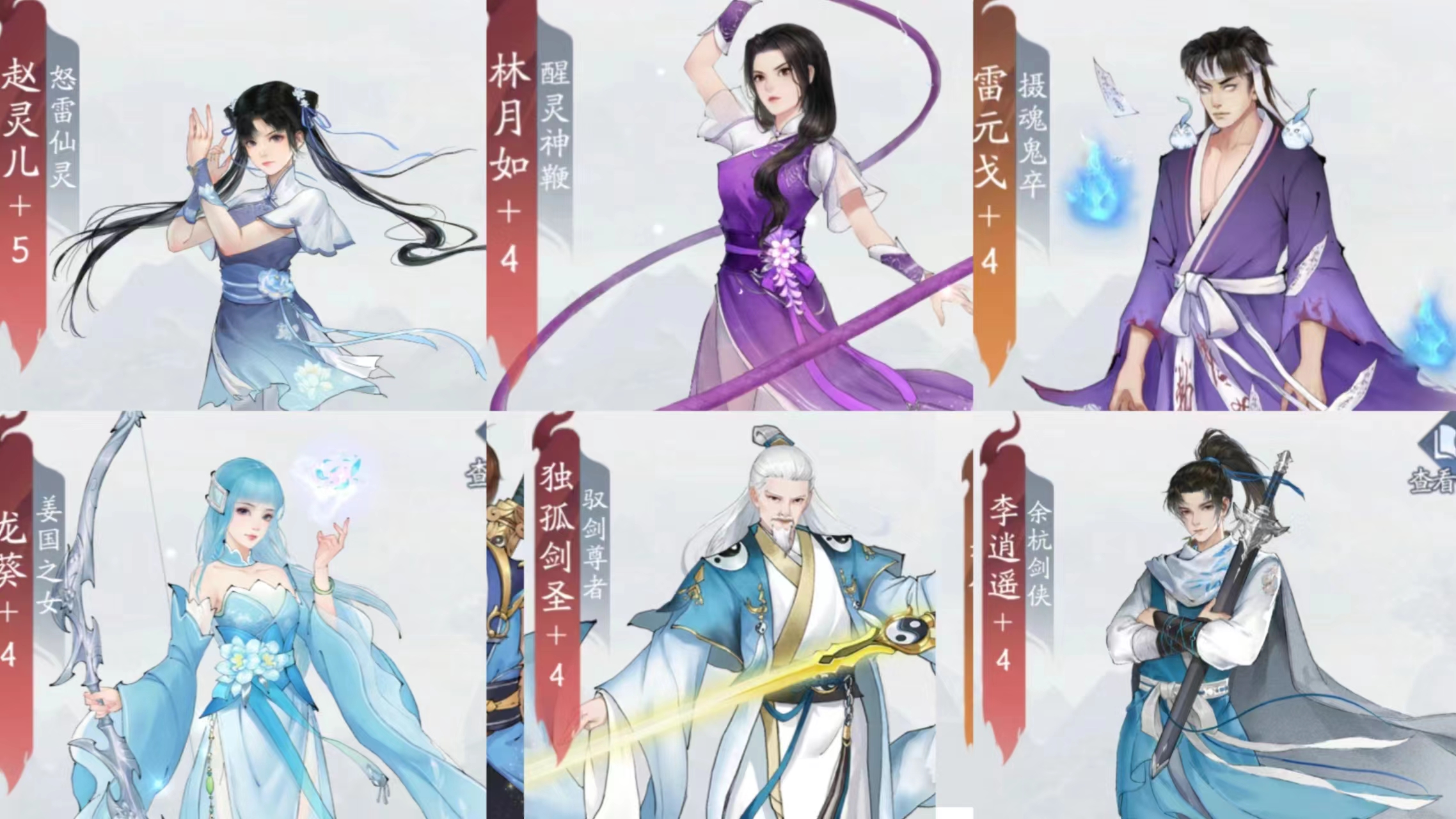 核心赵灵儿(雷)+李逍遥(风)+孤独剑圣(水)+林月如(雷)+雷元戈(水)+龙葵(火)