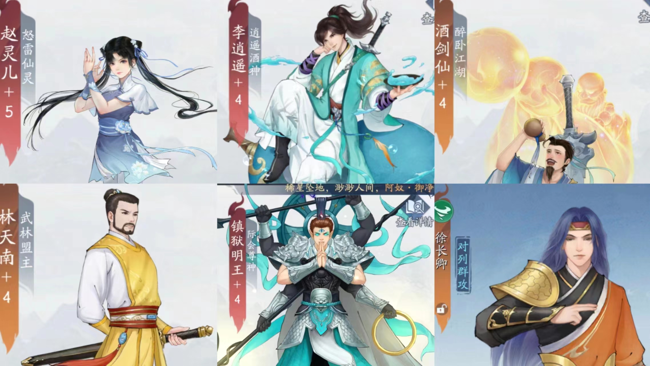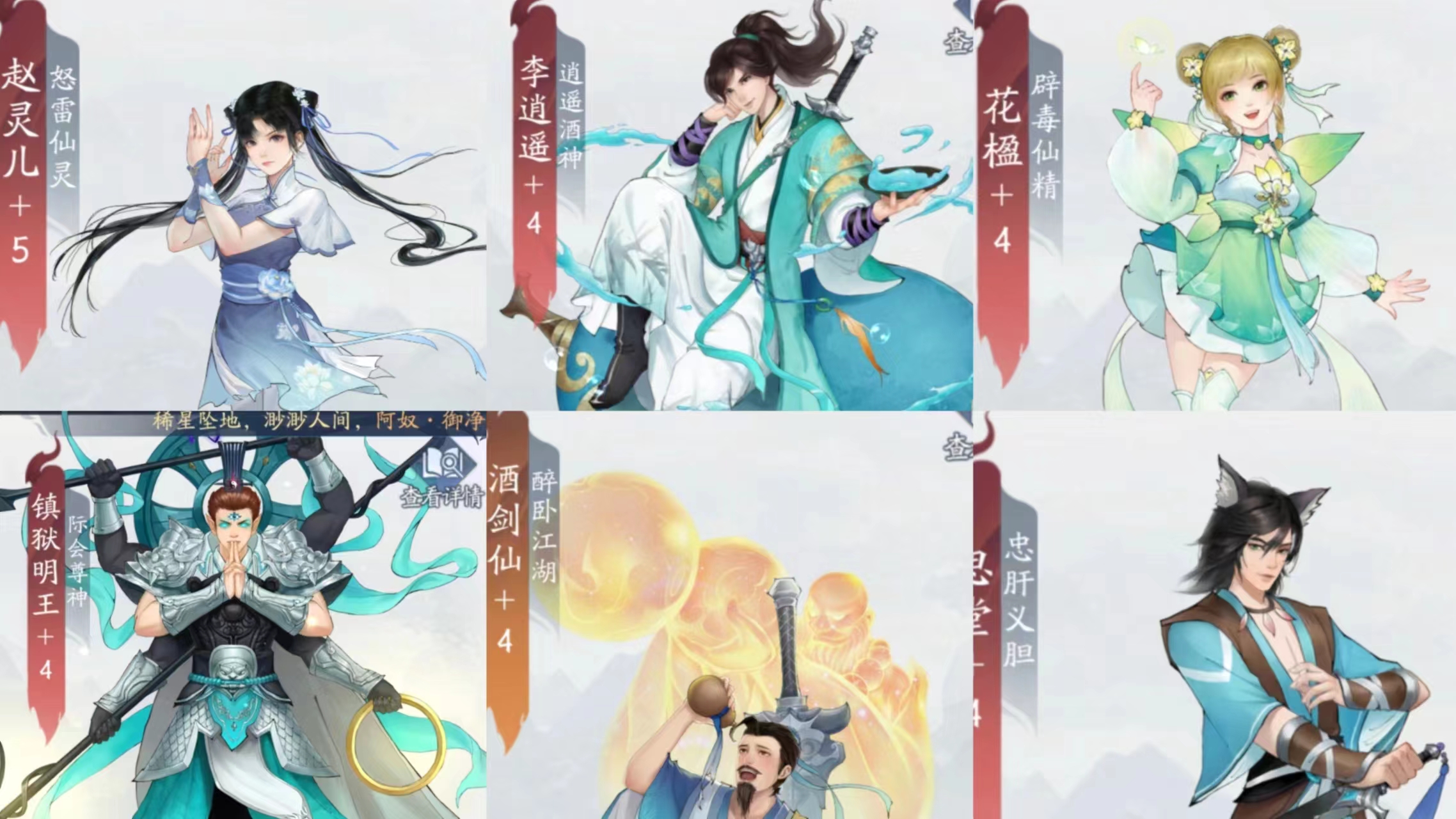 核心赵灵儿(雷)+李逍遥+(水)+林天南(风)+酒剑仙(风)+徐长卿(风)+镇狱明王(火)