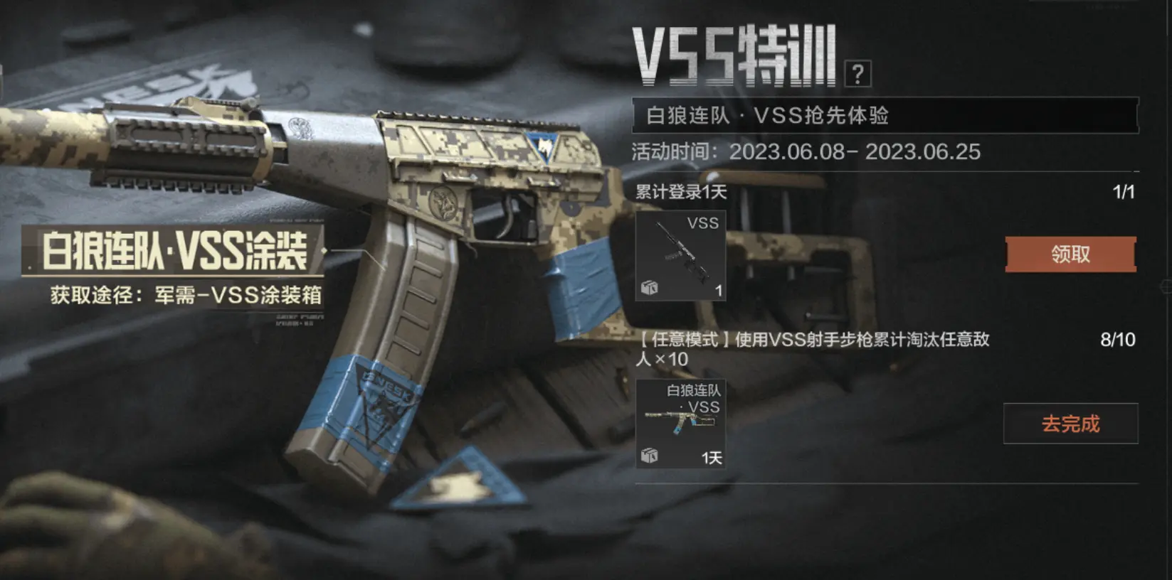 完成VSS特训还可领取VSS整枪及白狼连队·VSS体验卡奖励