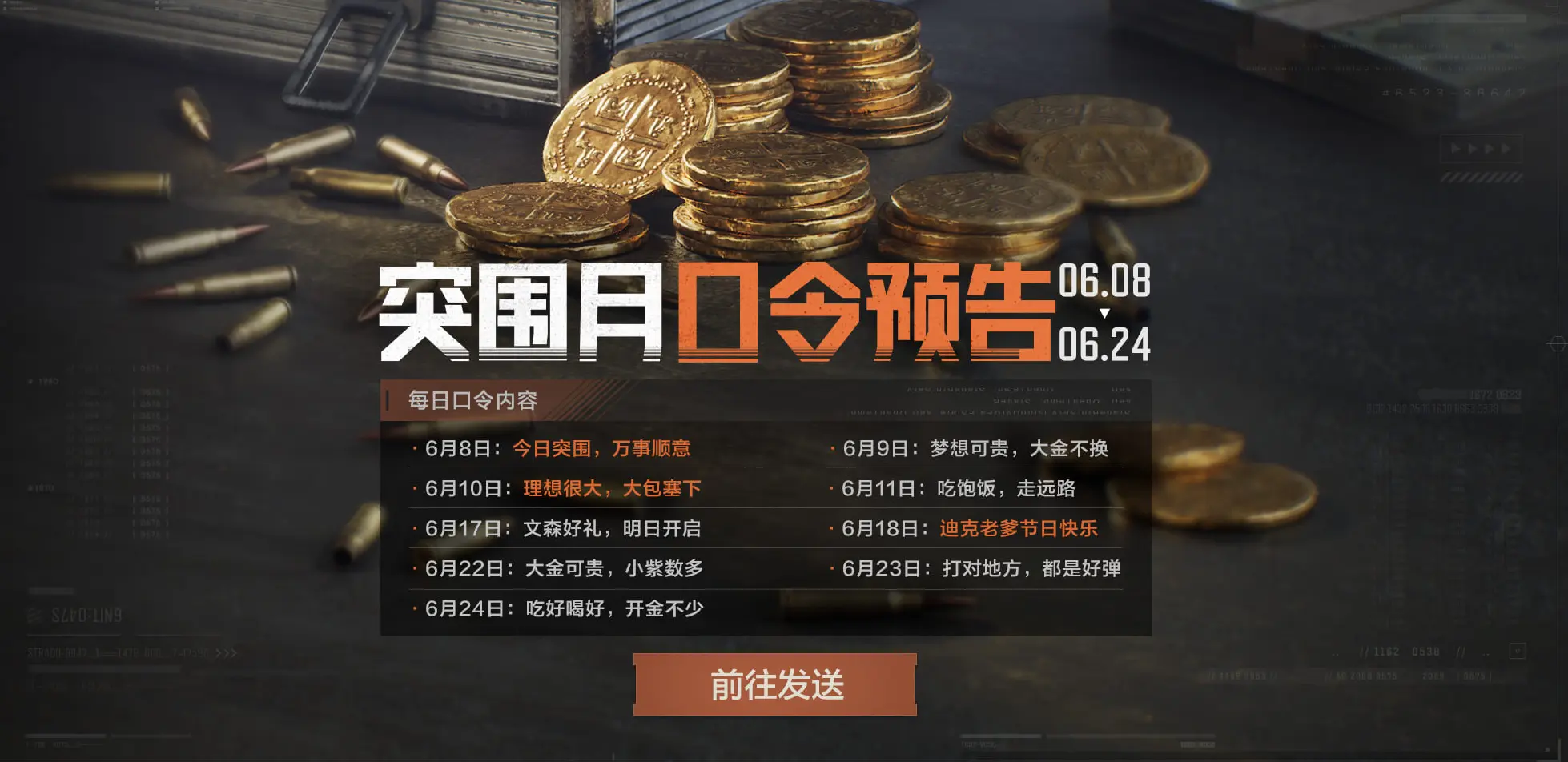 老皮后续也会在论坛和官方群公告中提醒先锋们口令内容!每个口令不同且一个口令只生效一次,所以先锋们不要忘记看好每日的日期,登录暗区输入口令,领取属于你的惊喜好礼!