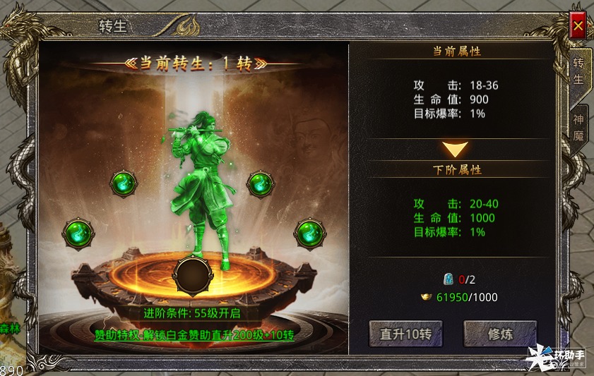 转生系统简介勤勉搬运的后辈君发布于 2023-06-12关注传奇中的特色玩法“转生”,一直是各位勇士热衷的项目,那《伏龙》的转生系统有什么规则呢?1、转生系统为30转,1级开放2、转生可增加角色生命值、攻击和目标爆率3、更高级的转生可穿戴更高等级的装备4、更高级的转生可进入更高等级的地图