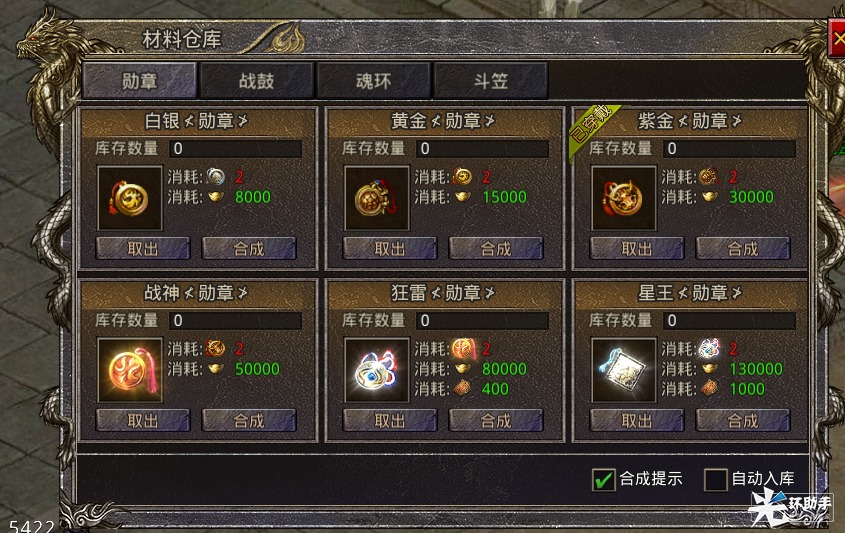 攻略-材料仓库勤勉搬运的后辈君发布于 2023-06-12关注相信勇士们都在《伏龙》里收获了大量的战利品,这些战利品的存放地点“材料仓库”,你又了解多少呢?1.特殊装备勋章、战鼓、魂环、斗笠装备可自动在背包存入材料仓库,50级开放2.在材料仓库中可取出或者直接合成高级特殊装备3.可选择“合成提示”、“自动入库”帮助更好处理收集的材料