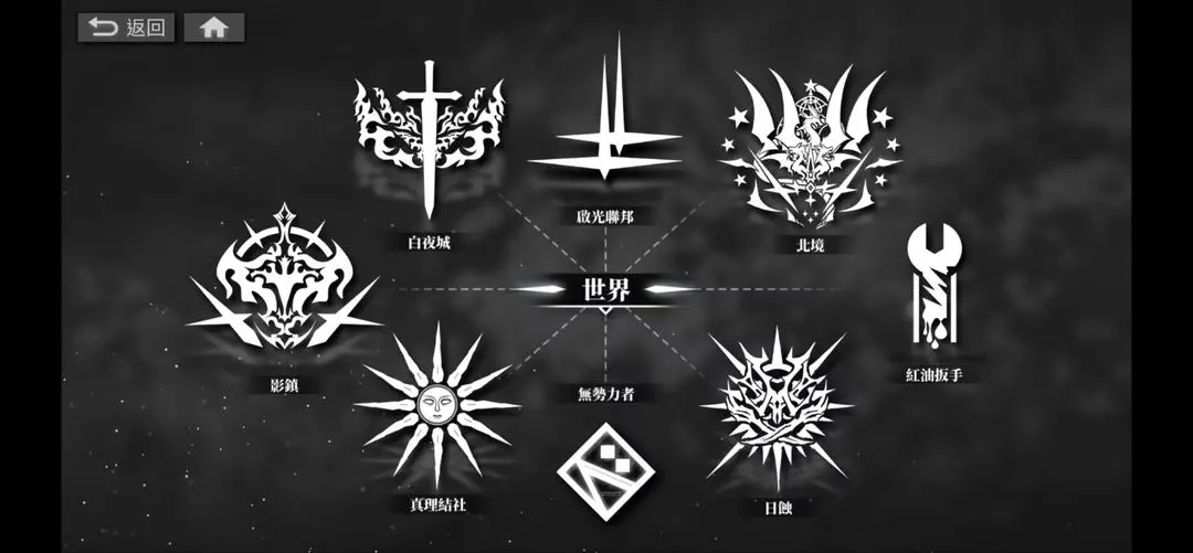 目前游戏共分为白夜城、影镇、启光联邦、北境、红油扳手、旻知会这几个主要阵营,除此之外还有部分无势力者,每一个阵营都有相关的剧情线可以体验,大家也会在之后的游戏内逐渐了解它们。