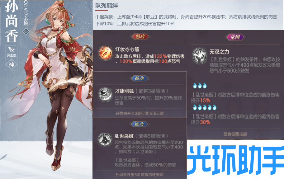 简而言之,孙尚香自身是一名切后排并且带有吸怒效果的输出型武将,又是一名光环将。
