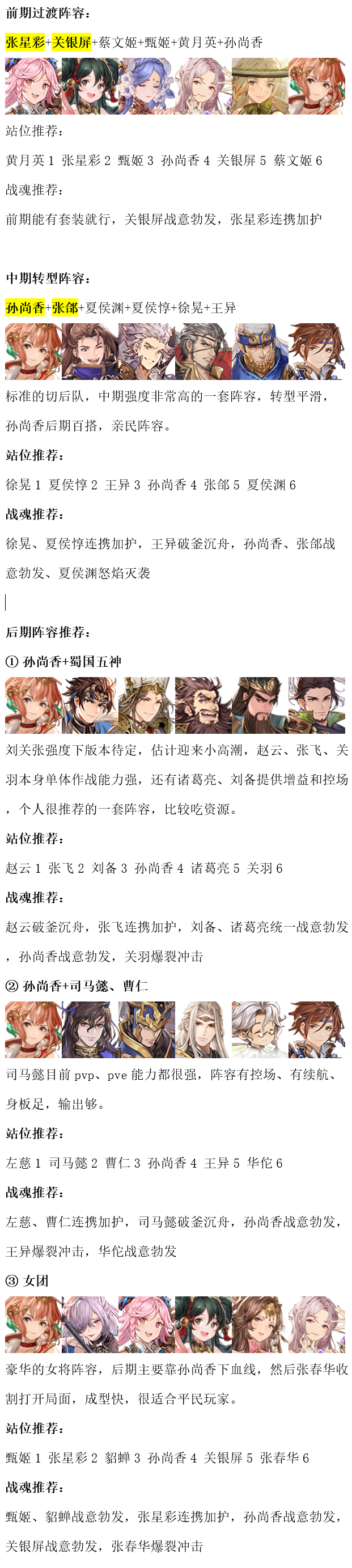 ③中期孙尚香为核心的切后队无论是pvp还是pve都很猛,能和大多数流行阵容抗衡,即使到了后期,孙尚香的战斗表现不如前面那么优秀,你也可以把她当成队伍里的一环,毕竟孙尚香非常地百搭,就单纯做一个光环将还能提供吸怒效果的,后期转型搭配刘关张可以,搭配司马懿曹仁也可以,搭配吕布貂蝉也可以,真正意义上的培养了不亏。