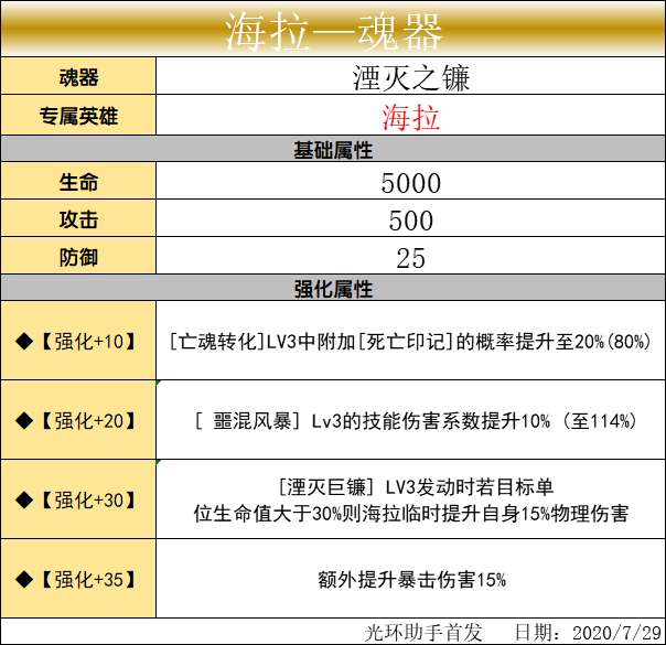 海拉的魂器觉醒只能说一般了,唯一能看的是暴击伤害+15%,作为半辅半输出,海拉并不是一个强力输出英雄,在菜刀里面,多加了15的暴伤只能说勉强加强一丝吧。