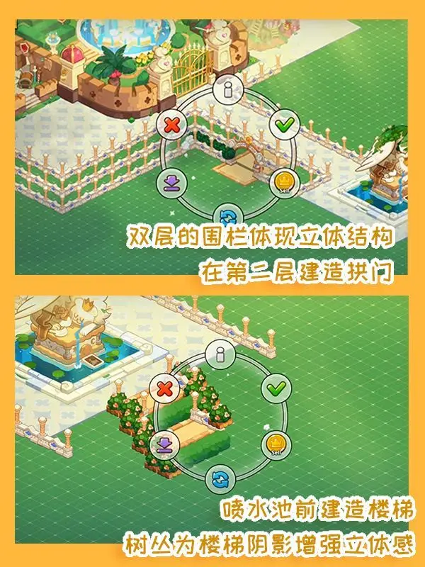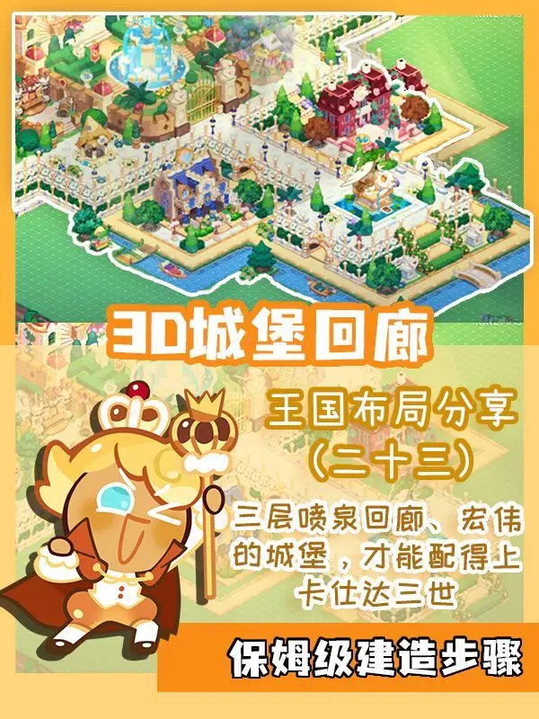 3D城堡回廊 | 姜饼人装修流程白喵岚岚发布于 2023-06-15关注新一期装修教程来啦!这期可是大工程哦。环绕在城堡外围,开满鲜花的三层喷泉回廊,是一个超大型3D建筑!登上台阶,沿着回廊绕过喷泉,就能到达宏伟的城堡。这样装修的王国简直气派满分!利用视觉错位打造回廊的华丽重叠,是时候检验同学们前几期3D建筑的学习成果啦~快打开游戏一步一步建起来吧!From Hi-Youzen 作者:蓝莓鸟