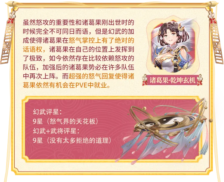 2、武将现状诸葛果至今仍然是最强大的怒气循环组件,但是碍于怒气系统的逐渐边缘化,诸葛果的地位也大不如前,即使在最需要怒气循环中的女团队伍中也鲜能见到诸葛果出场。虽然她在怒气领域有强大的统治力,但是过于单一的作用让她的综合功能无法再跟上时代。
