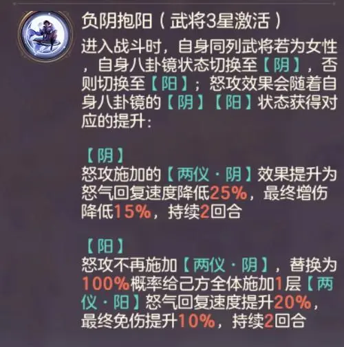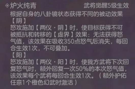 炉火纯青:强化诸葛果怒攻,“阴”状态控制敌方回怒,“阳”状态加快我方武将回怒。