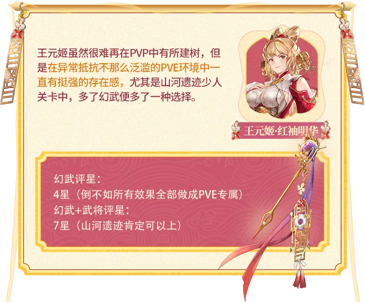 此技能明显是有意更改王元姬的定位,让其在PVE(主要是山河遗迹)中更加如鱼得水,让小将军在面对困难关卡时有更多选择。