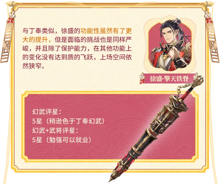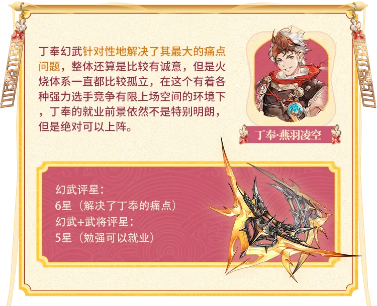 小将军们好~新一批专属幻武上线后,玩家@幼崽做了技能解读和武将分析,并且对幻武做了星级评价,希望能对大家有所助益~