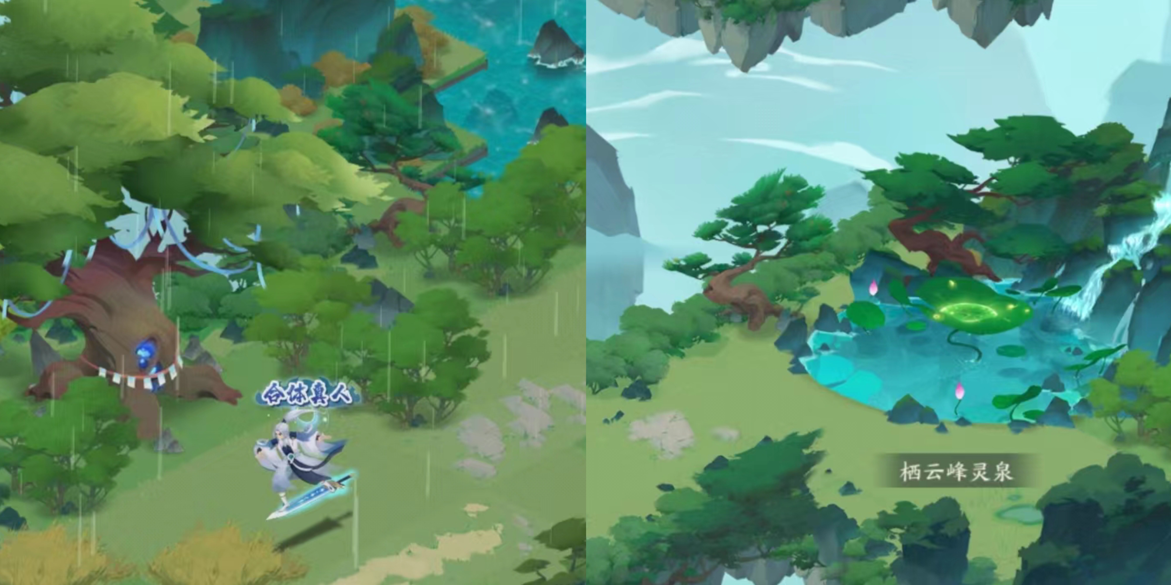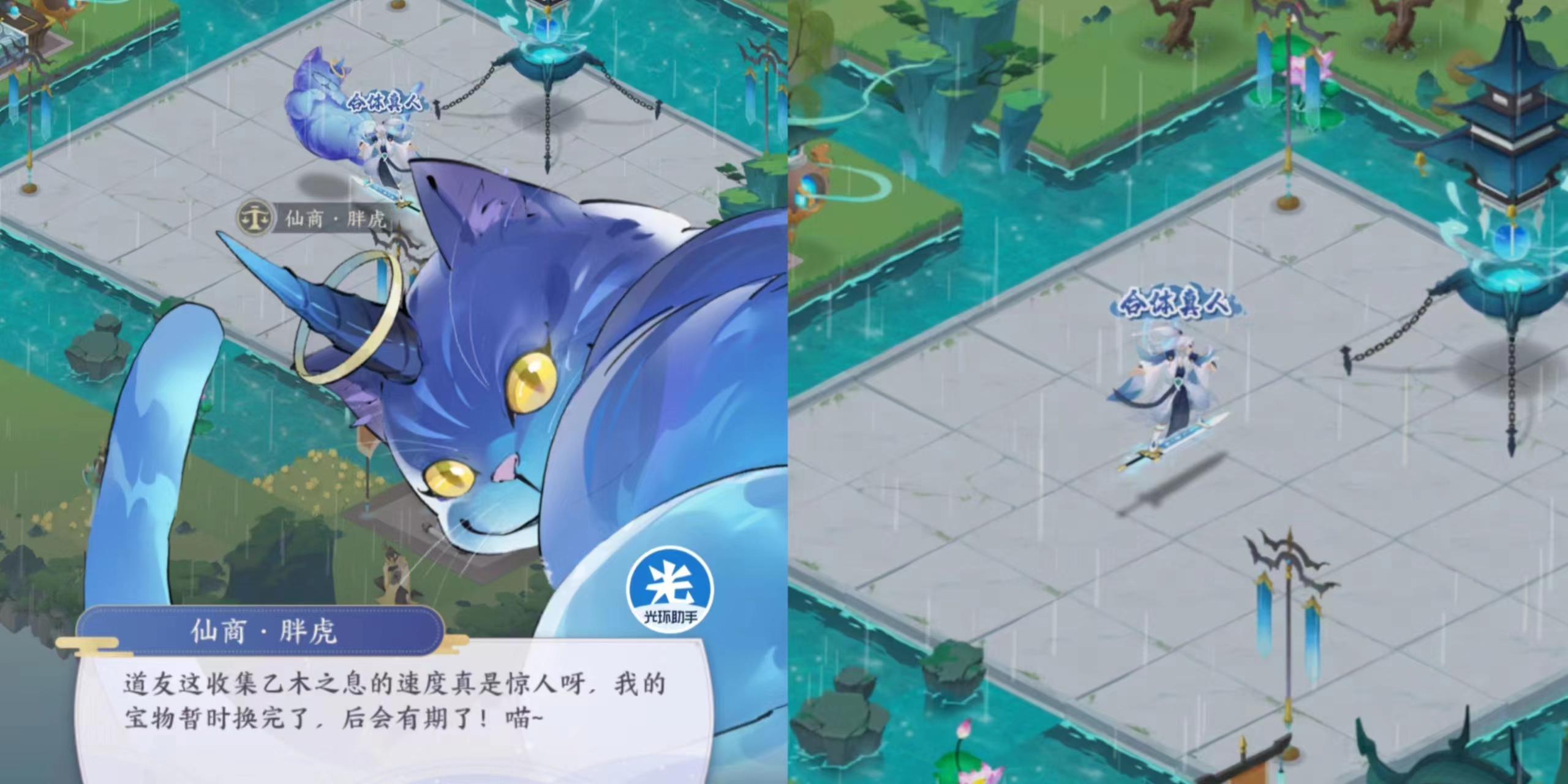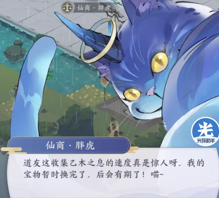 注意这里的大红树要点5-6次左右才有反应,这也很多人会忽视的地方,这个乙木之息也是最难找的。之后仙商胖虎就会出来给你45个乙木之息。