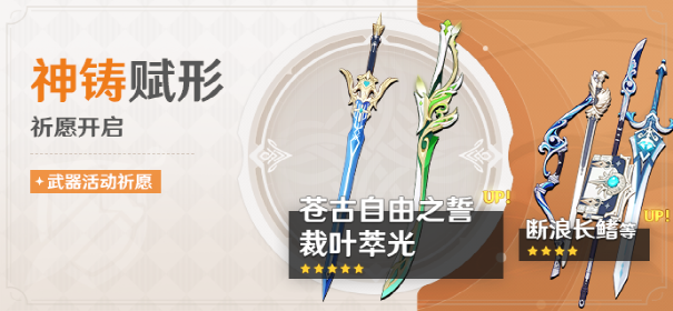 *PS:其中「单手剑·苍古自由之誓」「单手剑·裁叶萃光」「弓·曚云之月」「长柄武器·断浪长鳍」为限定。