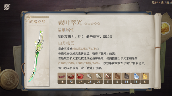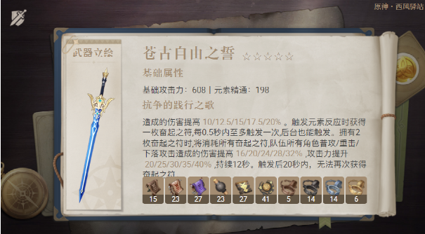 装备评价:具有辅助增伤/增攻能力的五星单手剑,触发辅助的条件并不困难,但其元素精通副词缀对角色泛用性有一定程度的限制,不过定位为辅助的单手剑角色均可以考虑使用。