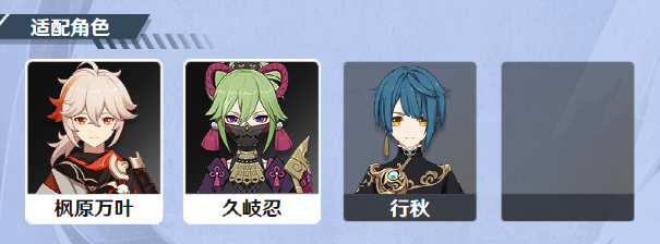 「久岐忍」:在超激绽队伍中,久岐忍佩戴该武器时,其副词缀能够提高忍触发超绽放时的反应伤害,而武器特效能够为驻场角色提供攻击力与增伤。