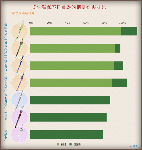 「艾尔海森」:自身固有天赋对“元素精通”数值有着额外增伤转化,且突破增加“草元素伤害加成”,使得艾尔海森在增伤区无需武器弥补数值,而其普攻/战技交替攻击的高频蔓激反应化以及且该武器基于“元素精通”提供的伤害值,弥补了该武器的“白值低”“攻击低”的问题,该武器高额的双暴属性补齐了输出该有的“暴击区”面板,至此艾尔海森三个输出乘区在该武器身上皆能得到补充,该武器毫无疑问是他的毕业武器。